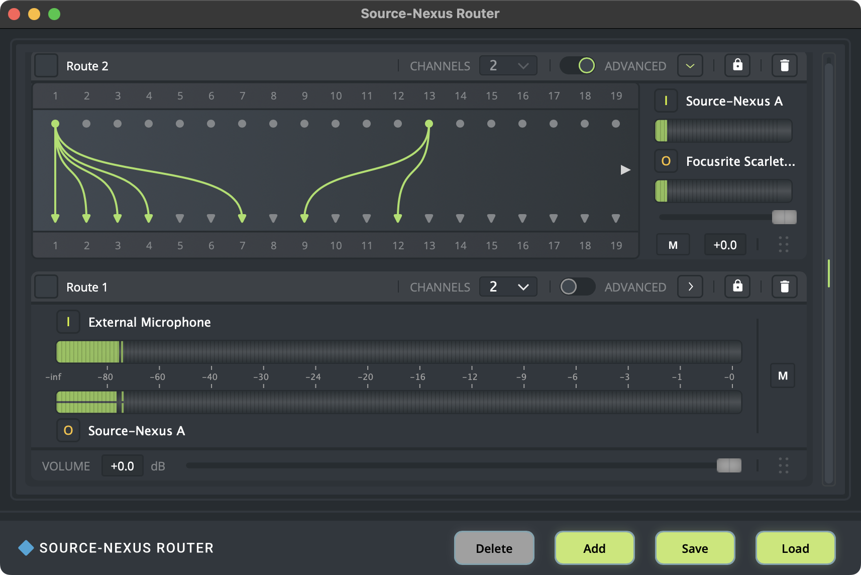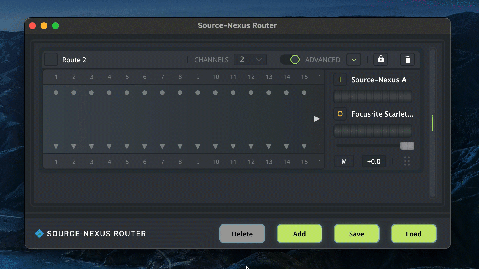 As mentioned in Source and Destination Audio Devices, the default number of channels for any new audio routes will be 2 channels. You can, however, map up to 16 channels (with one-to-one routing) and all of the channels (with advanced routing) with Source-Nexus Router. Doing so is quick and easy: