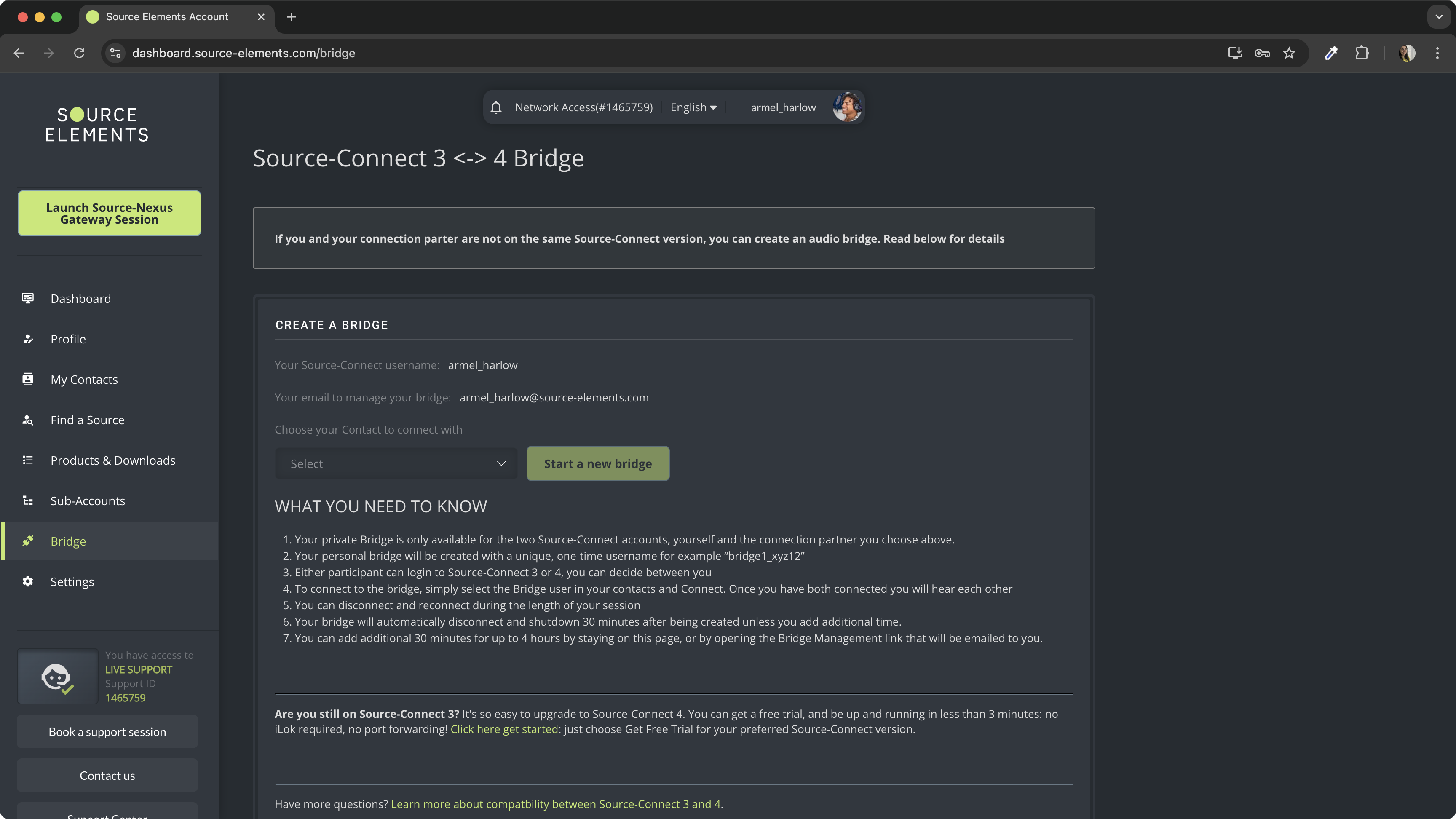 The Bridge Functionality in Source-Connect 4 allows users on Source-Connect 4 to connect with Source-Connect 3 users, because these versions cannot connect directly due to both major differences in the applications' architecture and to Source-Connect 4 sessions are encrypted. The bridge serves as a real-time converter, ensuring that your audio is properly transmitted between users in those cases where you both don't have time to download the latest version.