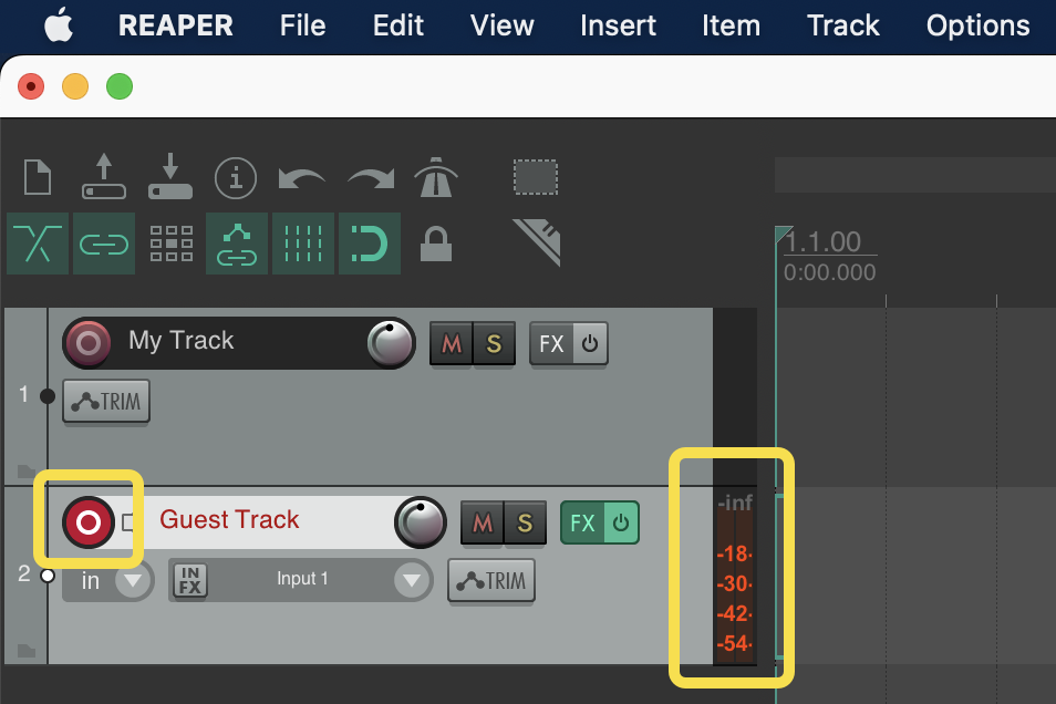 - Record arm the guest track by clicking the red record button on the track. Your track will look like the following one: