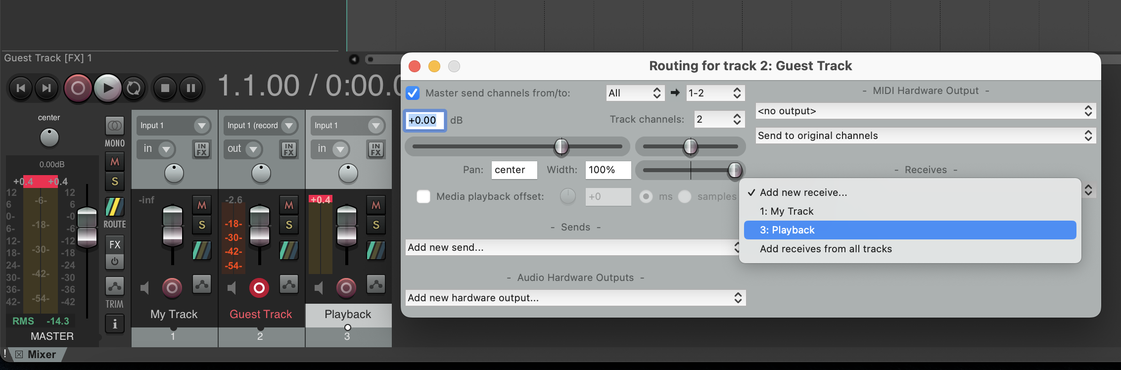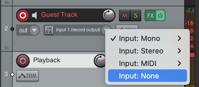 - Right click the guest track and select Record: output > Record: output (Mono)