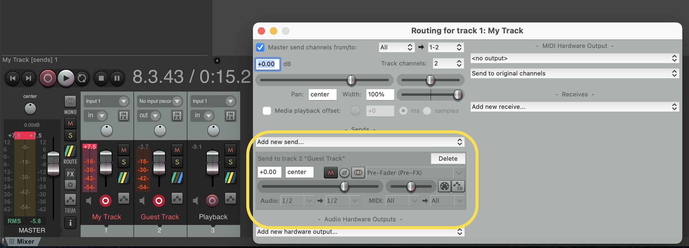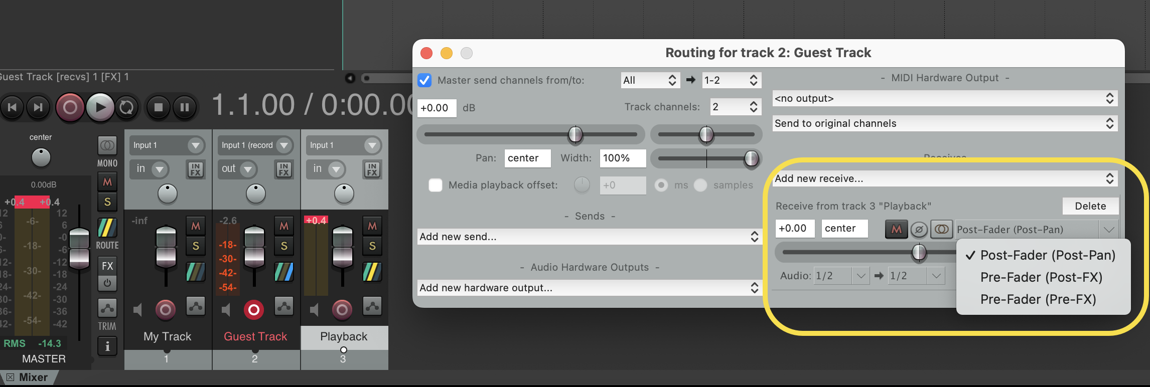 - Add a new send and select the Guest track. Also, change the type of Receive to Pre FX.
