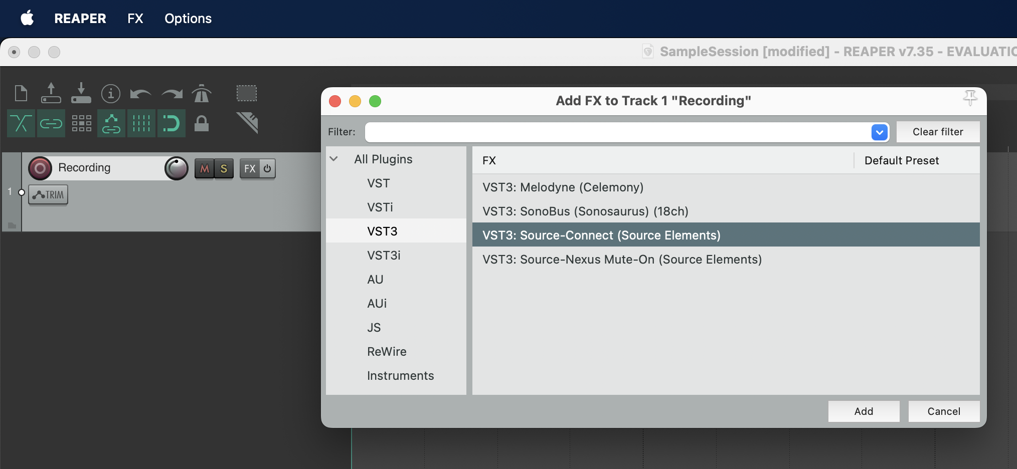 g. Click the FX button. In the Add FX to Track 1 “Recording” window that opens, click VST3: Source-Connect (Source Elements). Then, click Add.