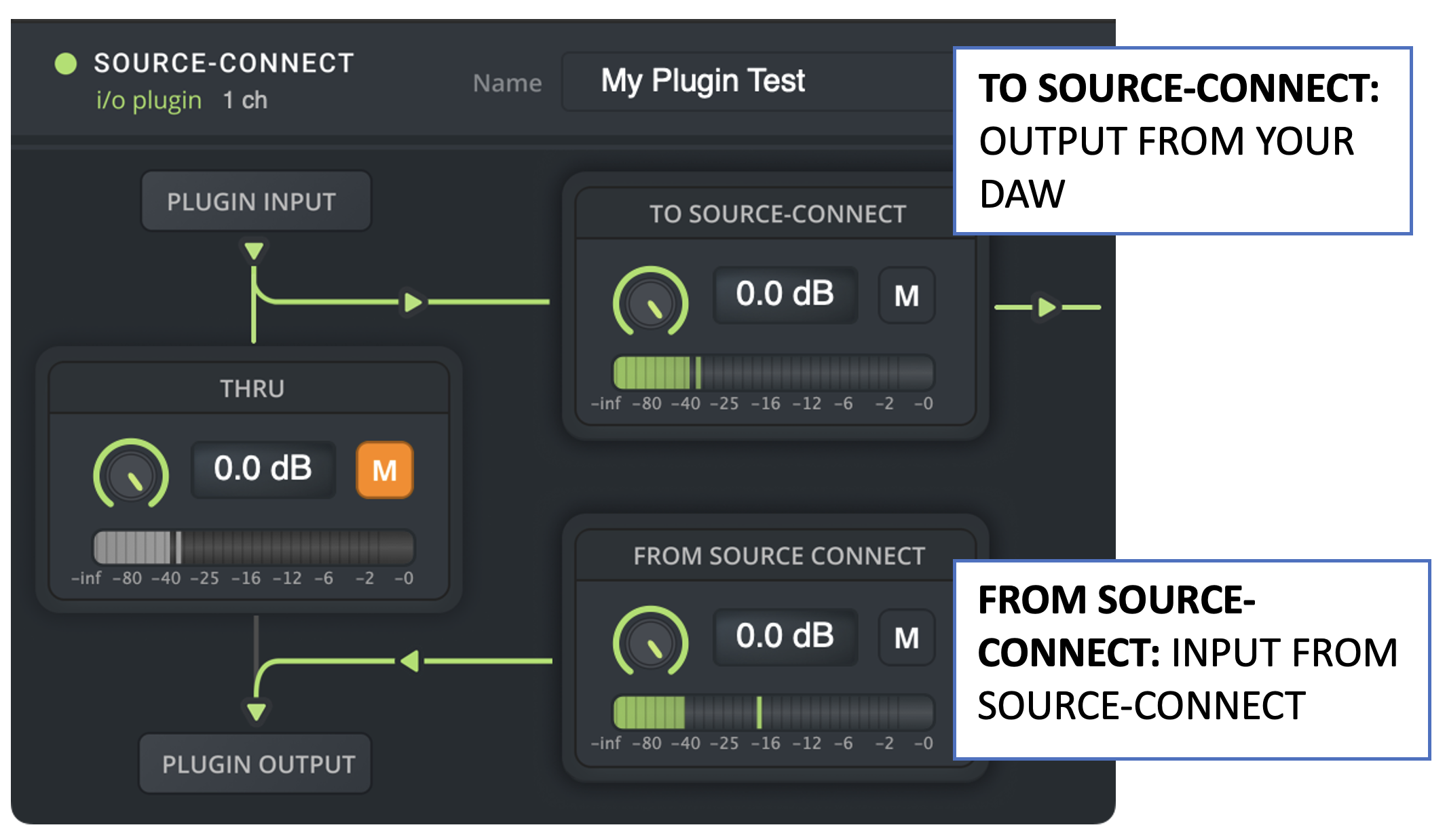 Source-Connect I/O works by routing audio from the track you add the plugin to on your DAW to the Source-Connect input, and then routing audio from the Source-Connect output back to the track.