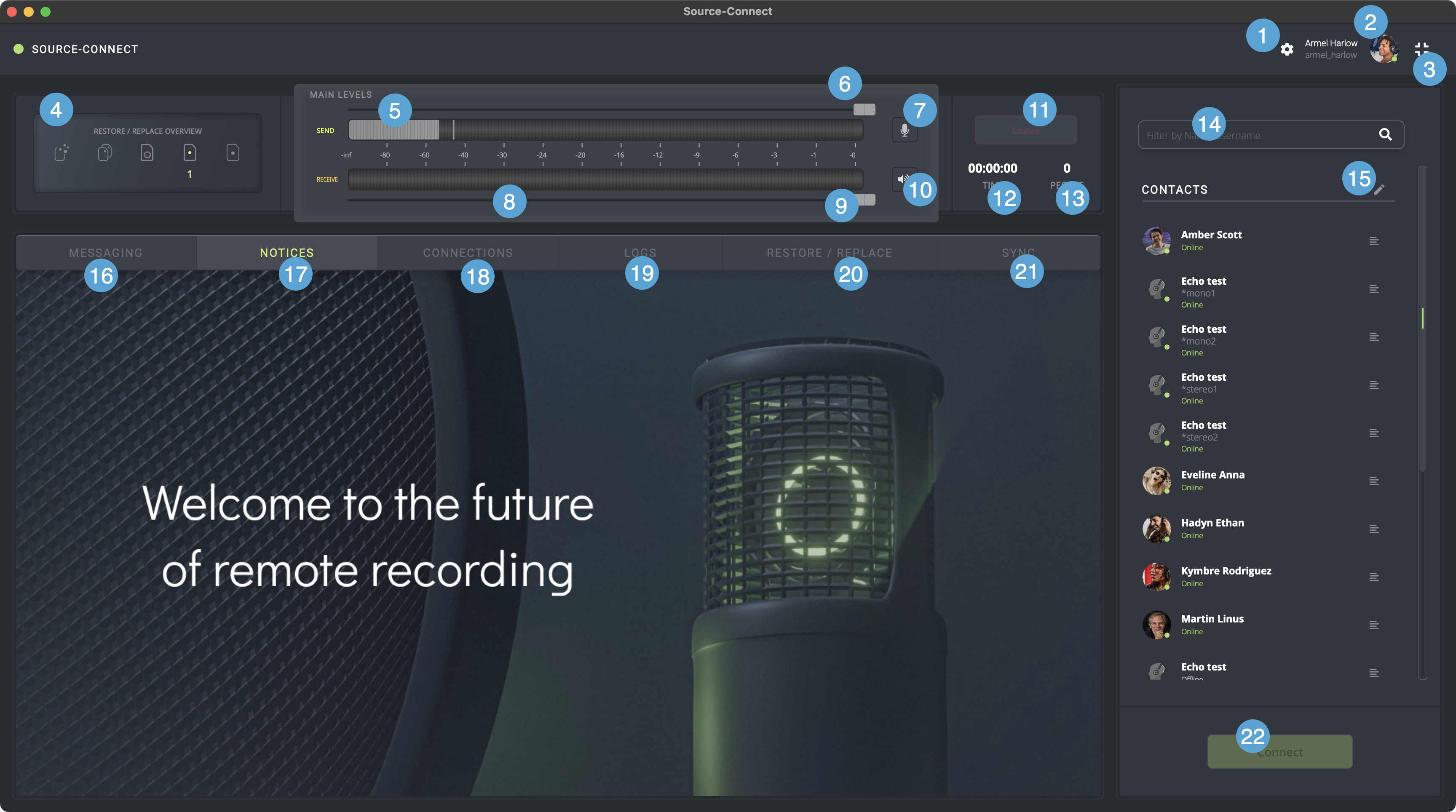 After logging in to the Source-Connect 4 application, you will see the new interface. By default, the “Notices” tab will be displayed. There are several menus and features to understand on this home page: