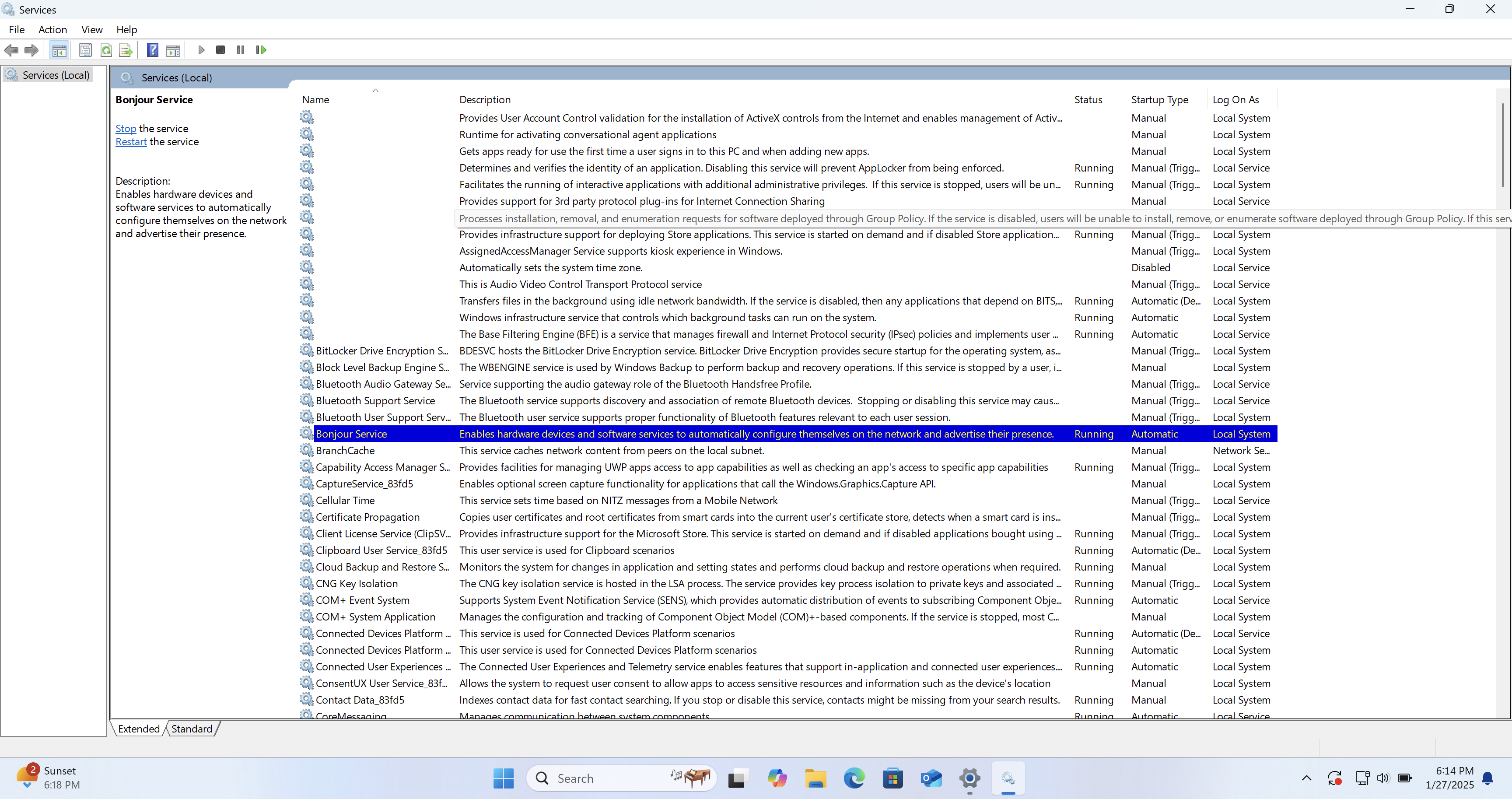 - On the list, look for “Bonjour Services”. Ensure that the status is “Running”: