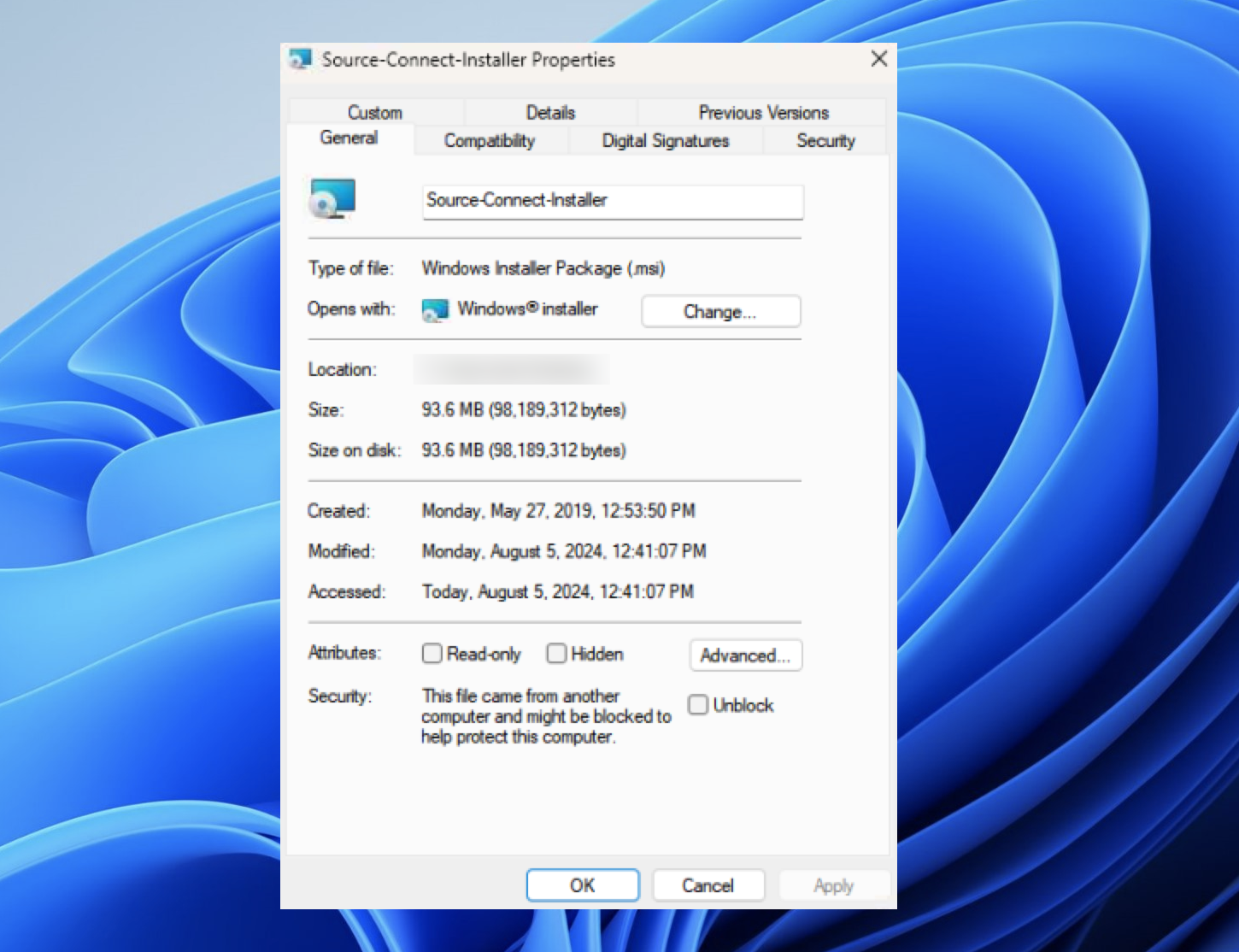 - In the “General” section, check if there is a Security message saying “This file came from another computer and might be blocked to help protect this computer”.