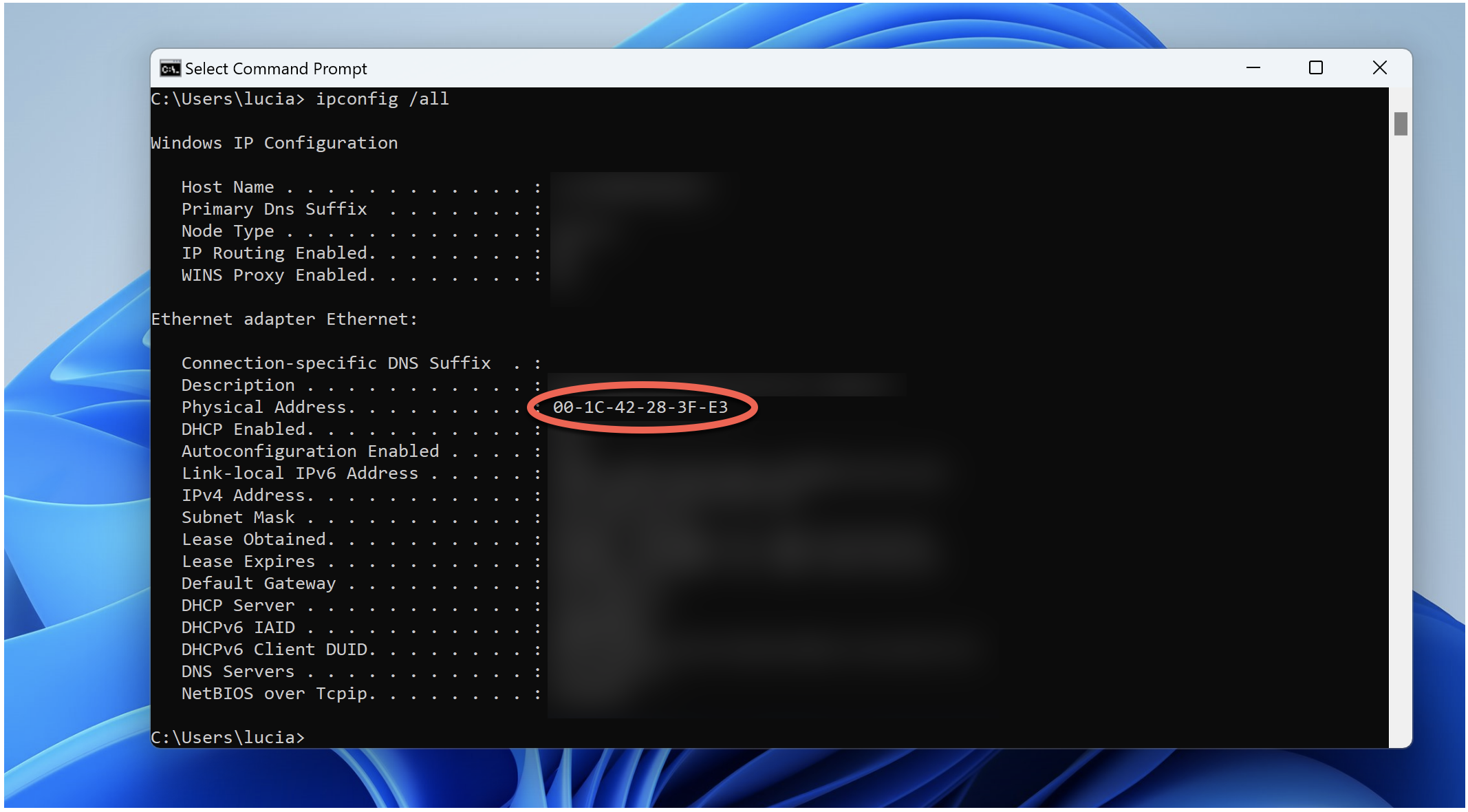 To find your MAC address, type in ipconfig /all on you command prompt. The “Physical Address” is your MAC address: