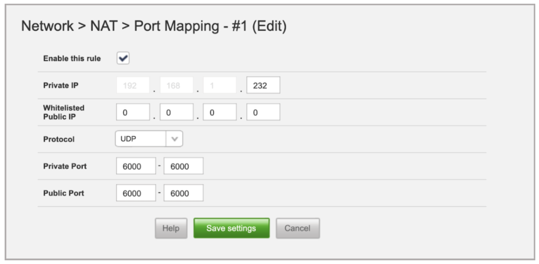 Select the Device you want to port forward to, then choose ‘Add port forward rule’. Enter 6000 for the port number or port range, and UDP for the Protocol. Some routers will ask for an internal and external port. You can enter the same port for both. Some routers will ask for an external or public IP, you can usually leave this blank.