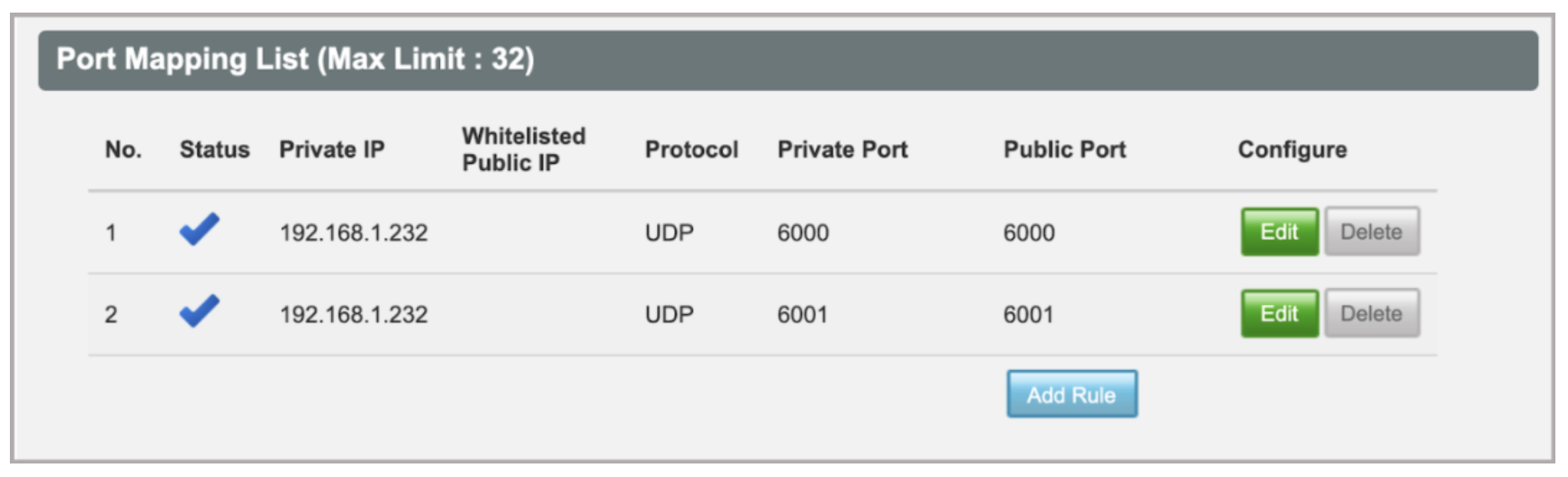 Select the Device again and add another port forward rule, this time for UDP port 6001.