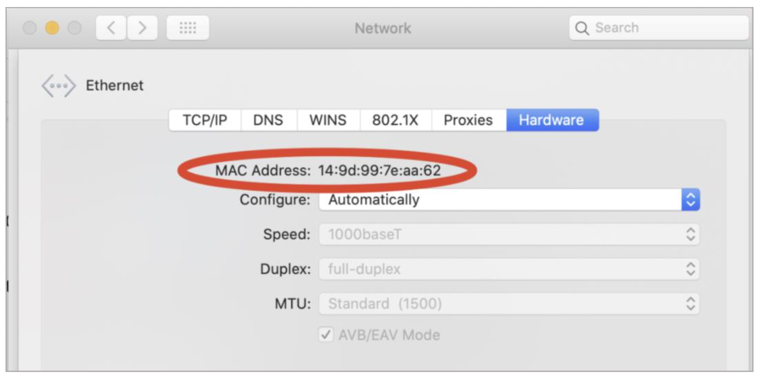 Click the ‘Advanced’ button in the bottom right corner, then navigate to the ‘Hardware’ tab in order to view your computer’s MAC address.