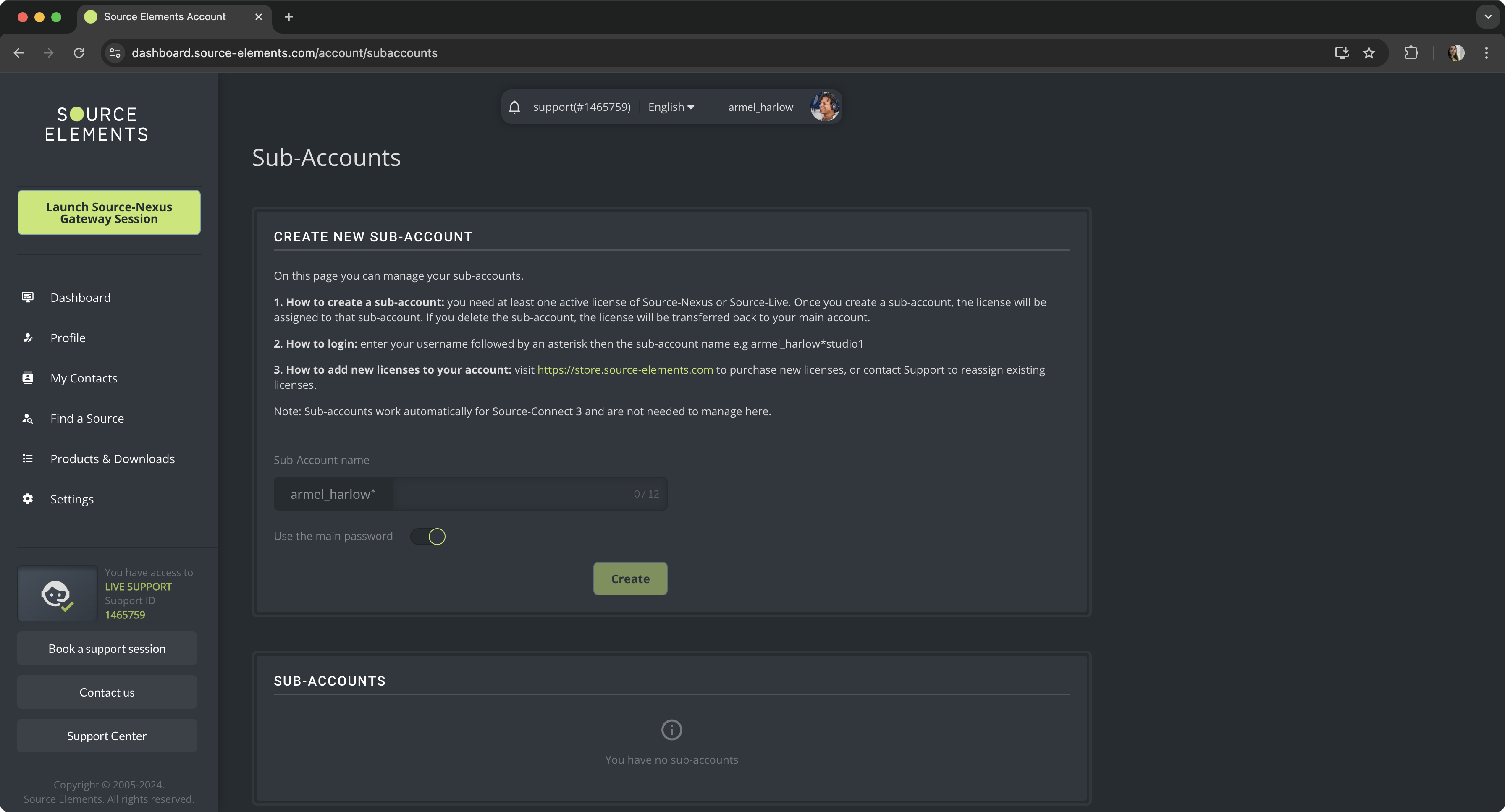 You can create a sub-account by going to the user dashboard and accessing the Sub-Accounts panel: https://dashboard.source-elements.com/account/subaccounts.