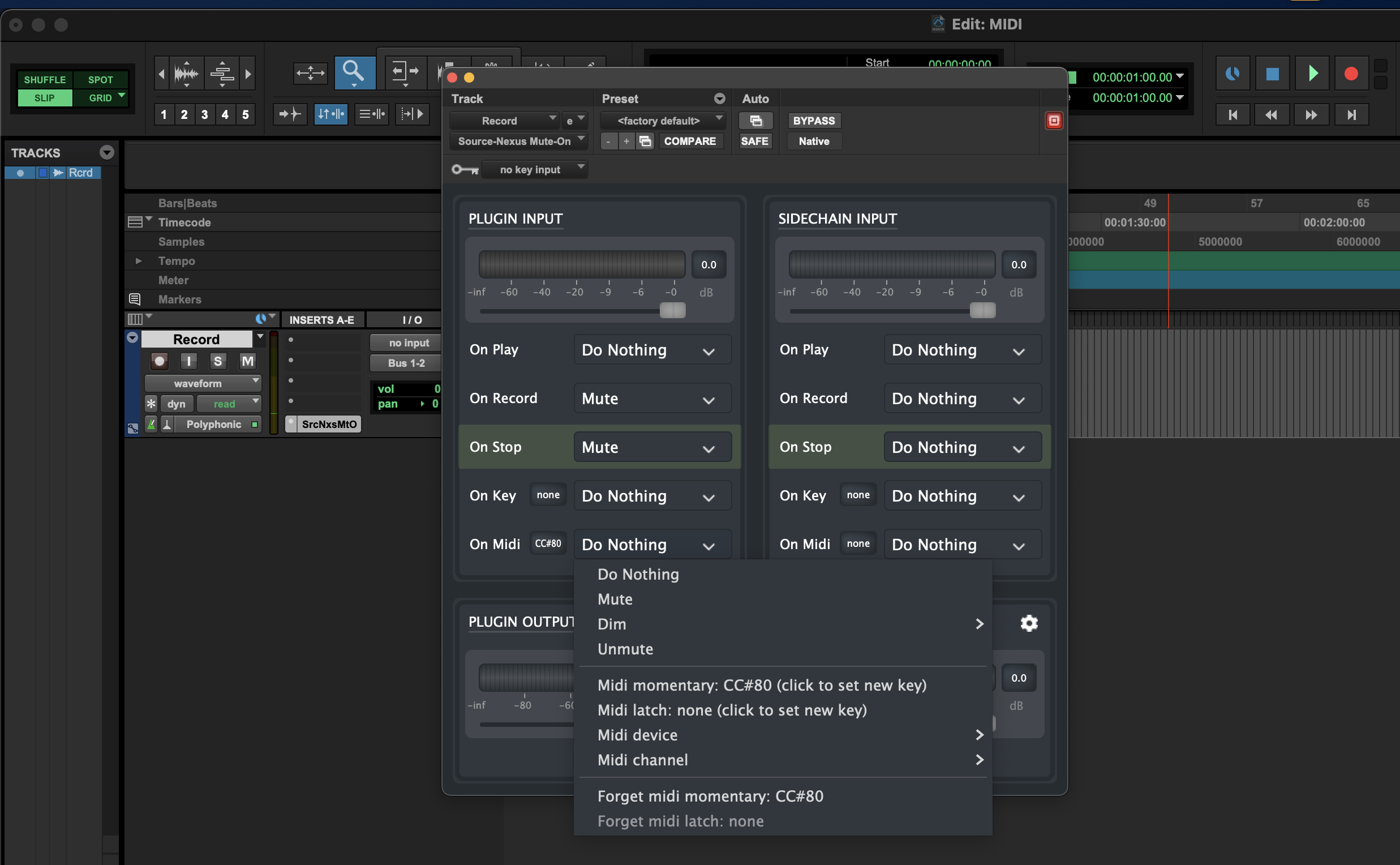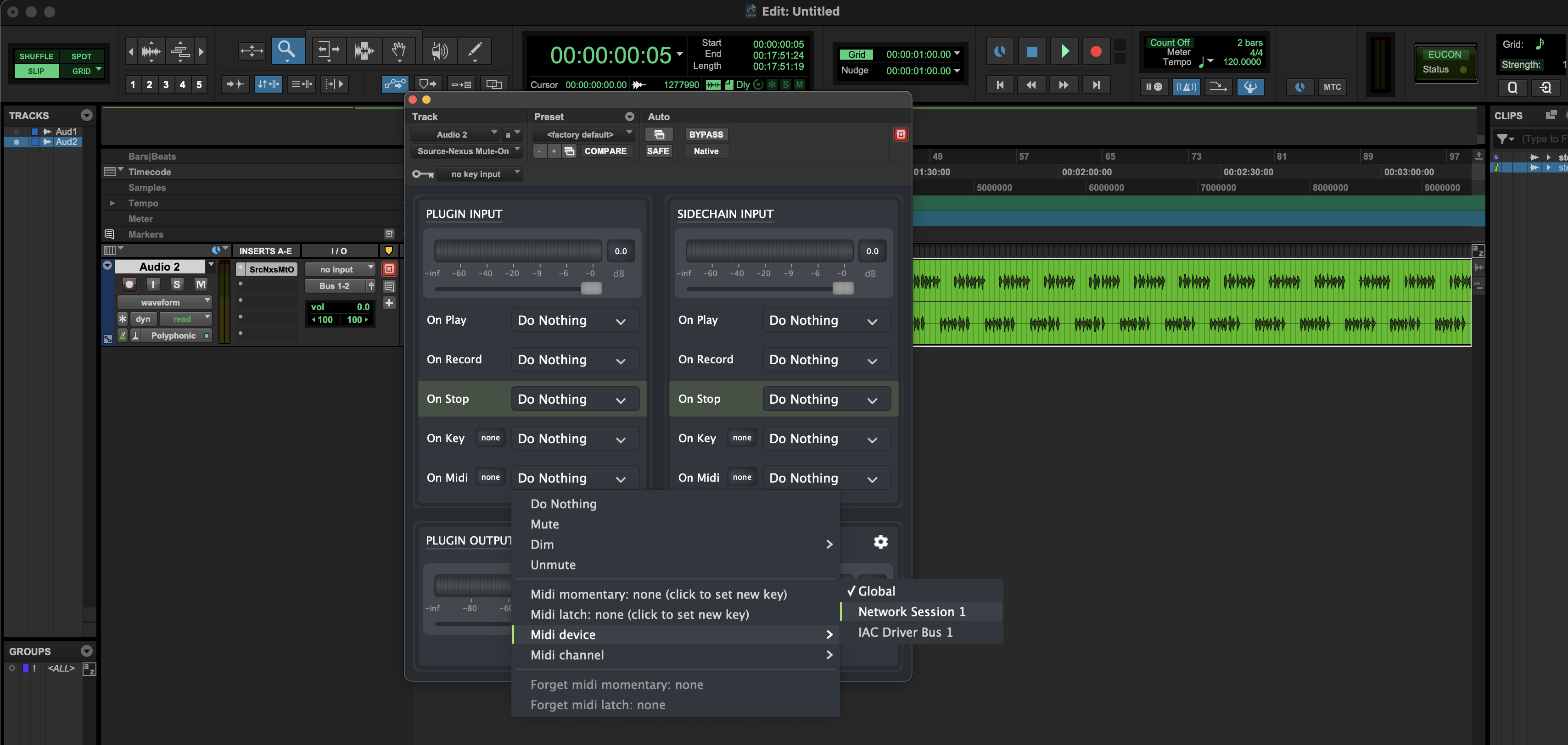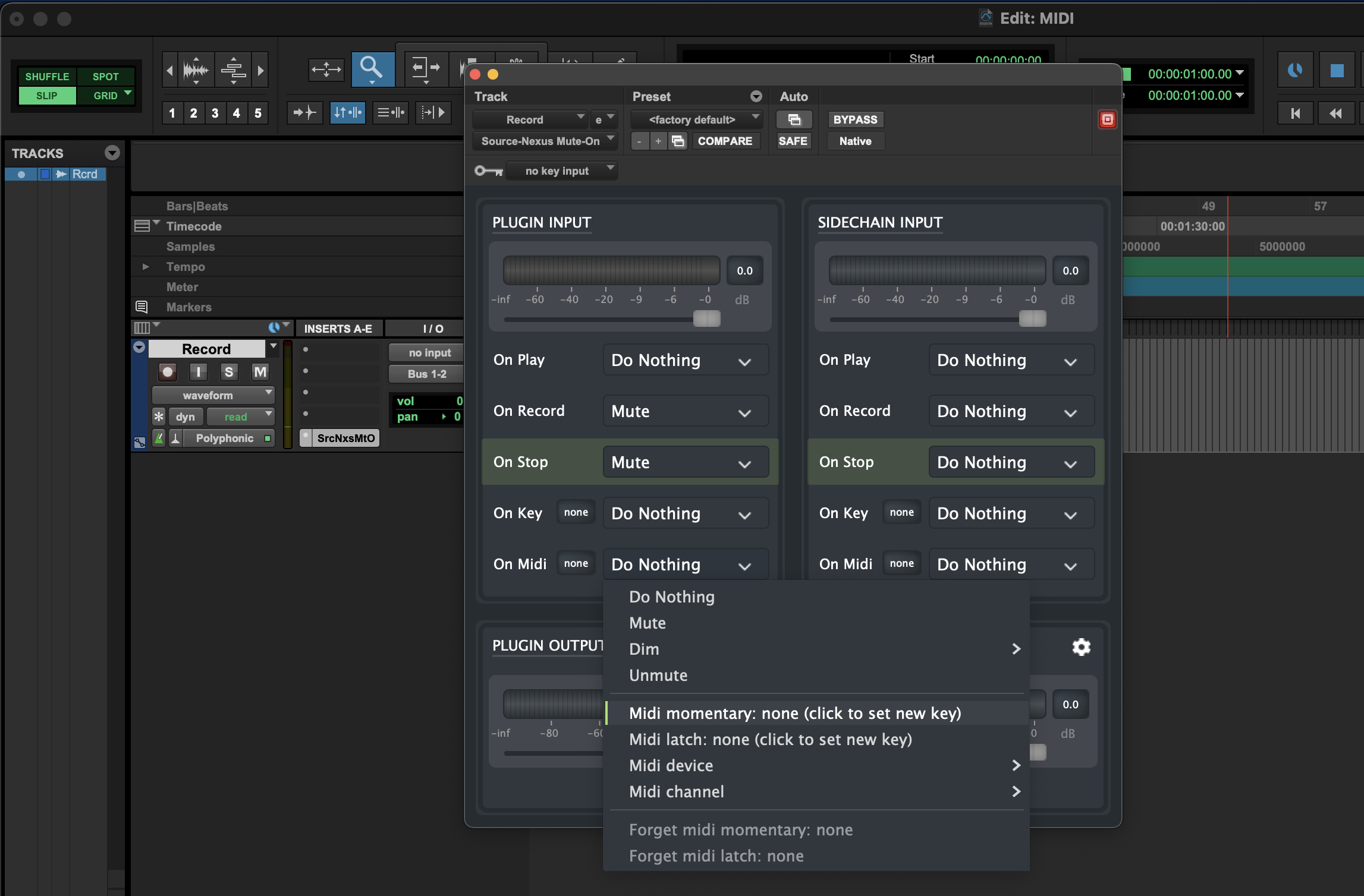 2. Open the dropdown menu for “On Midi” in the Mute-On plugin and set your MIDI device to the name of your MIDI Network Session (by default this will be “Network Session 1”).