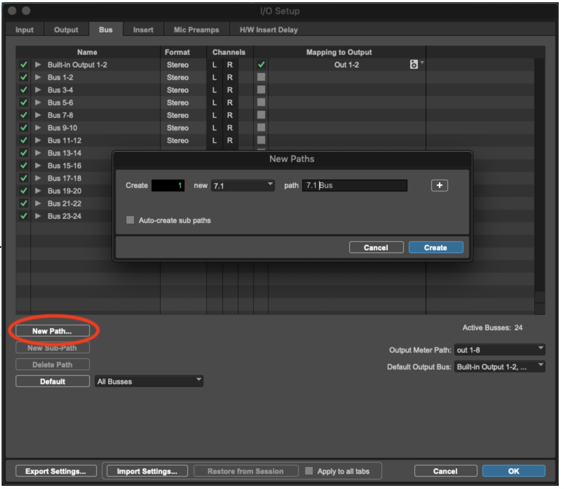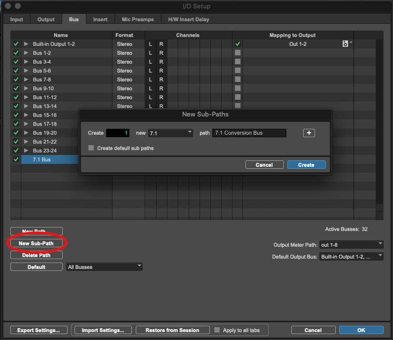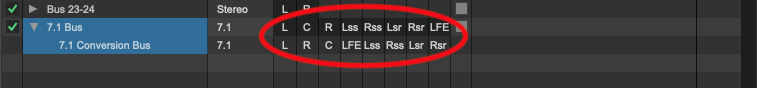 En Pro Tools , es posible crear un bus en la configuración de E/S para convertir entre estos órdenes de canales de audio envolvente. Estos son los pasos para crear un bus de conversión de orden de canales 7.1 en Pro Tools .