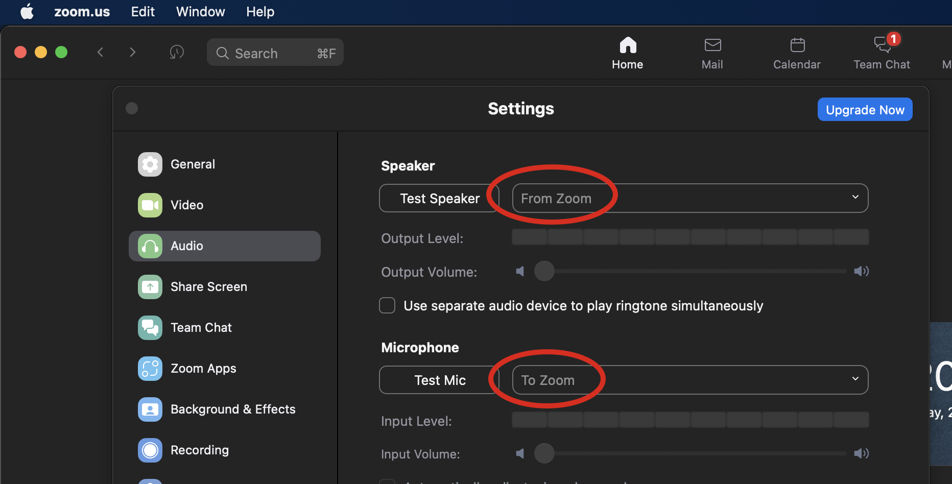 Zoom (micrófono a “To Zoom” y parlantes a “From Zoom”)