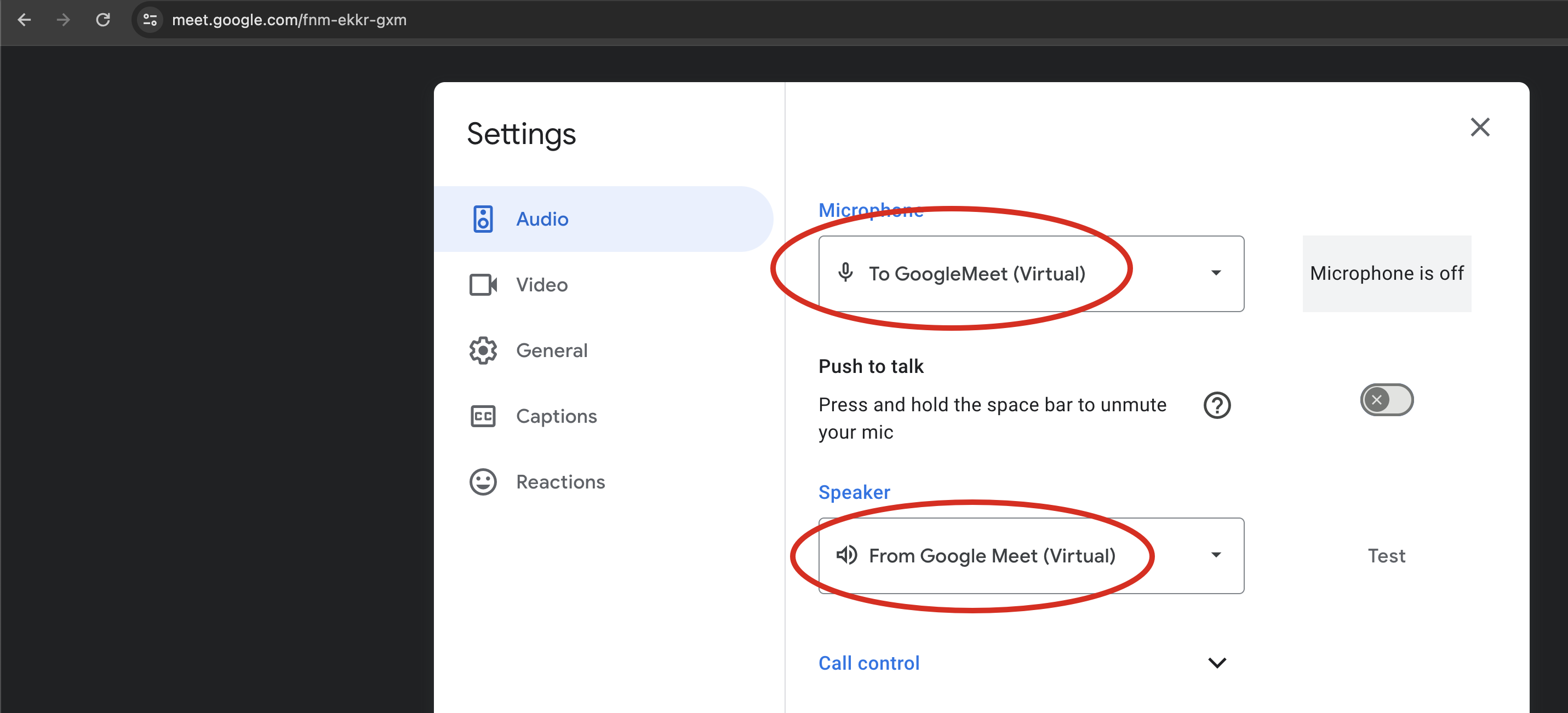 Google Meet (micrófono a “To GoogleMeet” y parlantes “From GoogleMeet”)