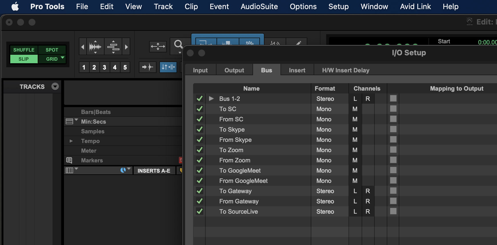 - Pista Skype: agregue los siguientes inserts: “To SC” (fader up), “To Gateway” (fader up), “To GoogleMeet” (fader up), “To Zoom” (fader up).