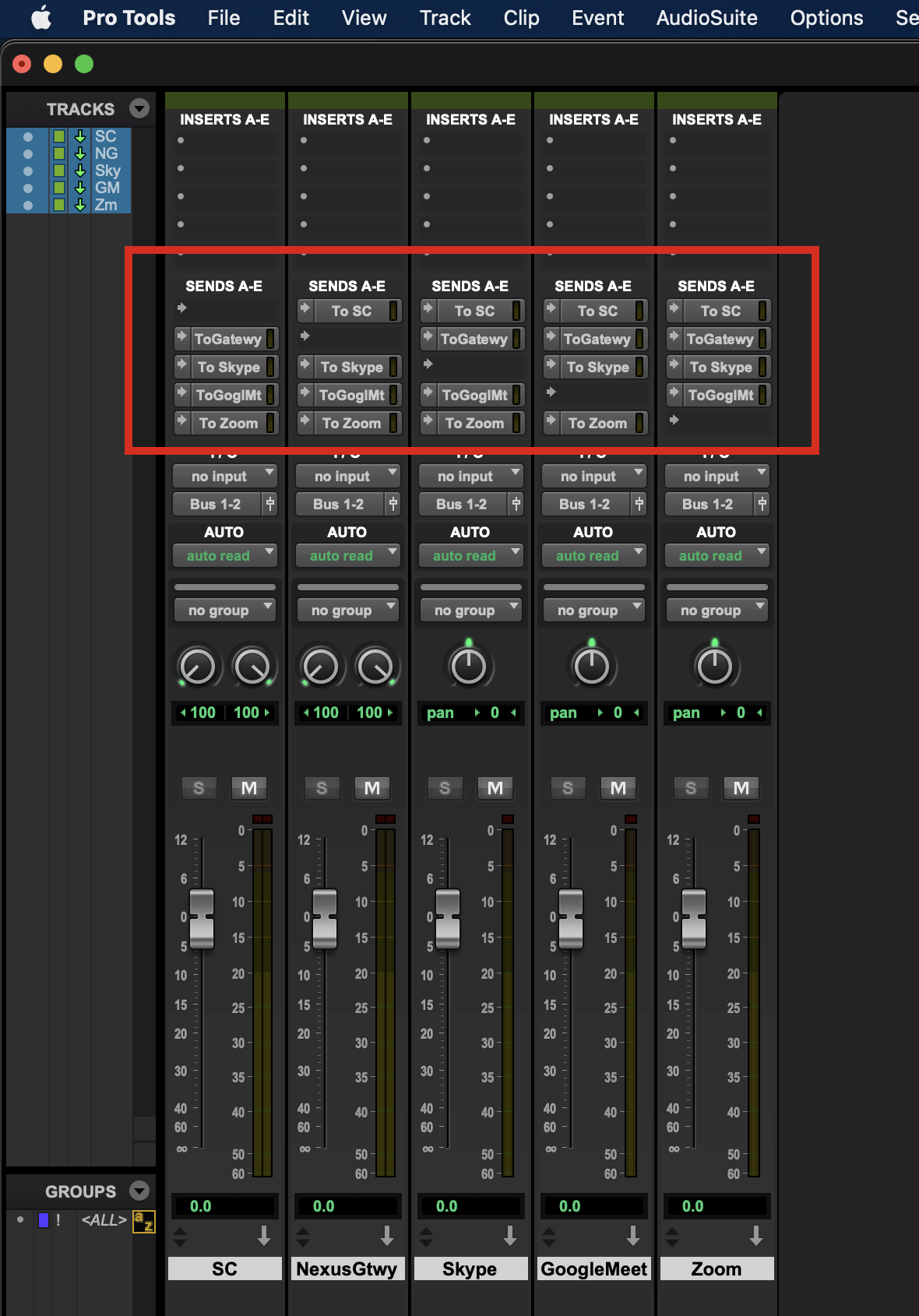 - Pista SC: agregue los siguientes sends: “To Gateway” (fader up), “To Skype” (fader up), “To GoogleMeet” (fader up), “To Zoom” (fader up).