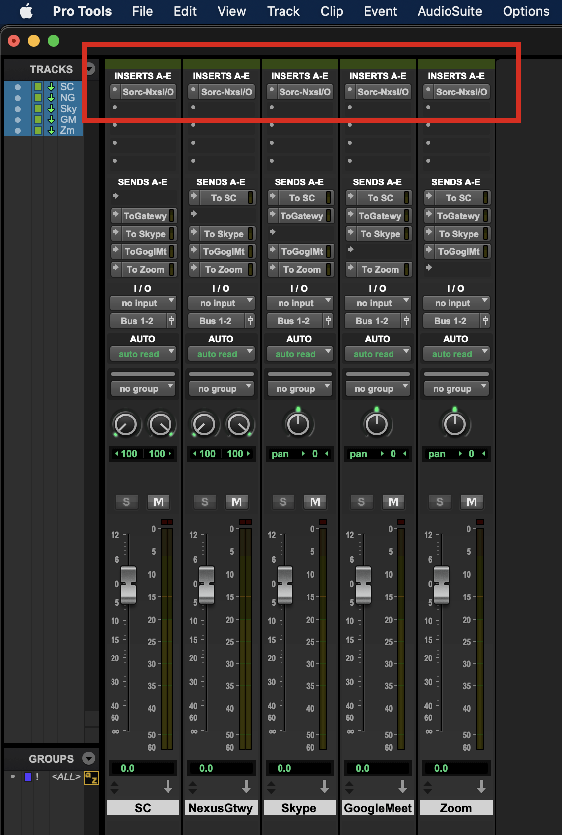 - Pista To Zoom: agregue los siguientes inserts: “To SC” (fader up), “To Gateway” (fader up), “To Skype” (fader up), “To GoogleMeet” (fader up).