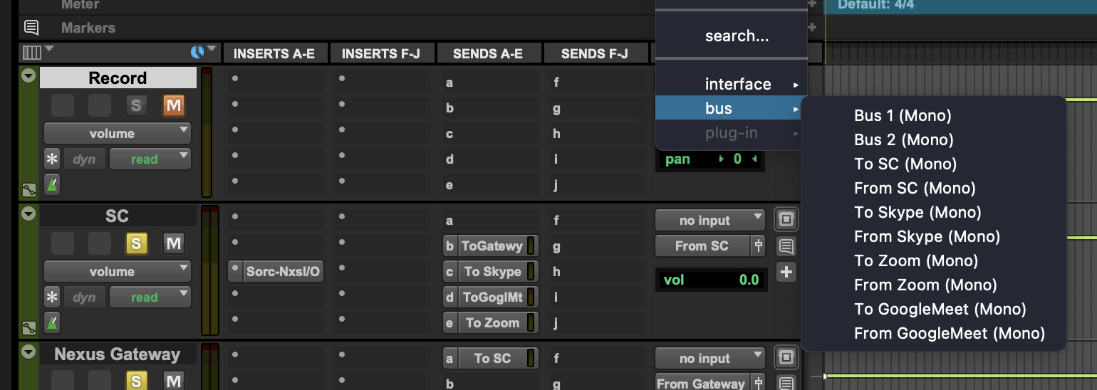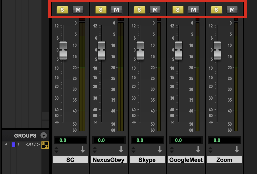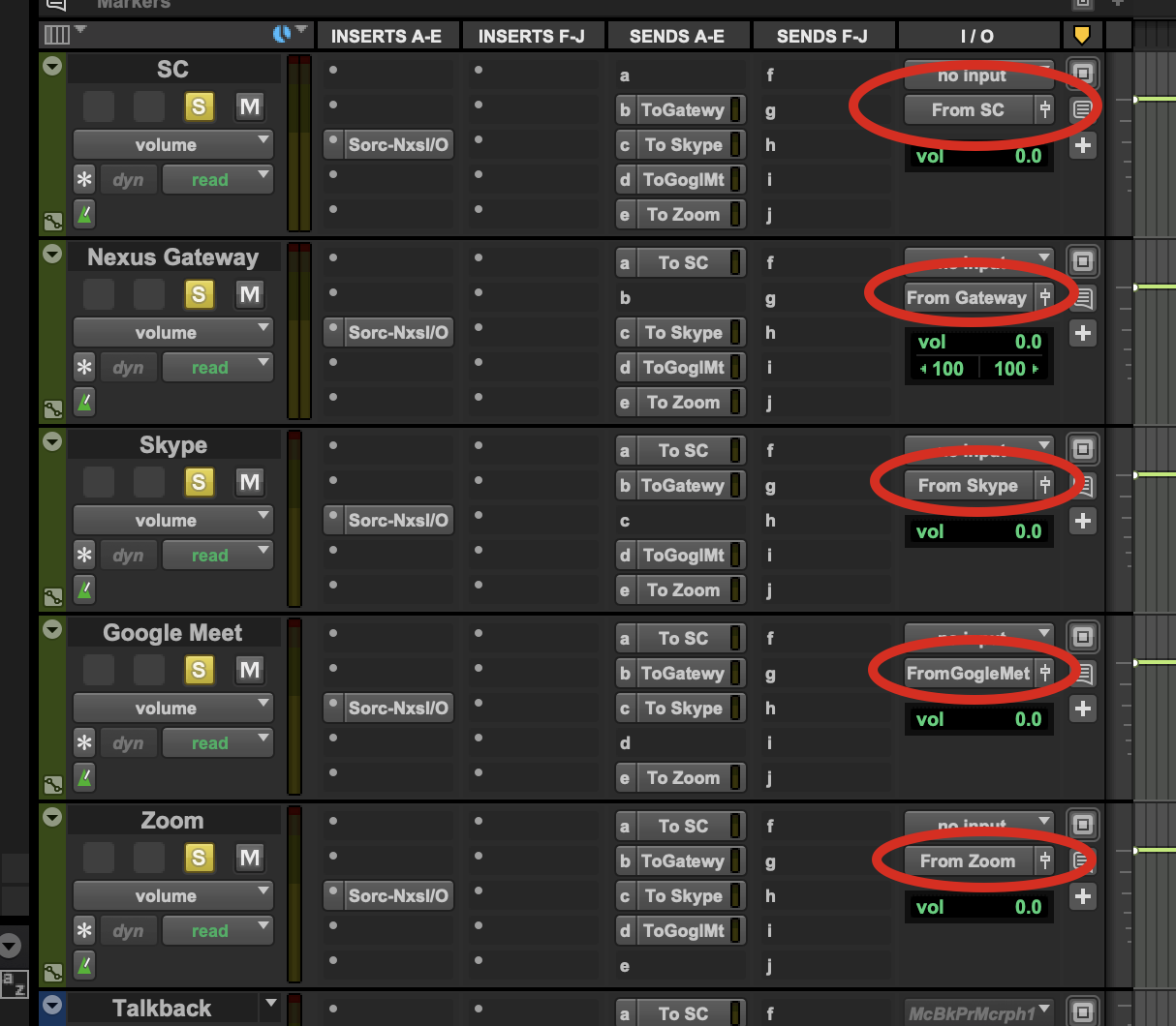- Pista Nexus Gateway: agregue los siguientes sends: “To SC” (fader up), “To Skype” (fader up), “To GoogleMeet” (fader up), “To Zoom” (fader up).