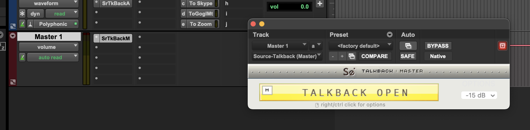 - Agregue el complemento "Source-Talkback (Aux mono)" como INSERT en la pista. De esa manera, podrá activar el talkback con la tecla "\" (barra invertida). Asegúrese de que el talkback esté abierto. En este punto, si todo está configurado correctamente, verá todos los envíos moviéndose en la pista.