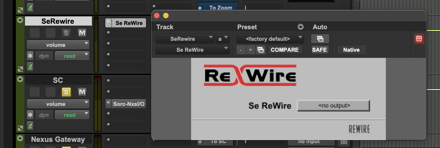 i. Primero, cree una pista auxiliar mono para Source-Live y llámela "SeRewire". Esta pista omitirá el complemento y, por lo tanto, tendrá la capacidad de decidir dónde los puntos finales escuchan al locutor durante el proceso de grabación en cuanto a latencia o calidad (Source-Live, o los puntos finales del cliente como Skype, Google Meet y Zoom). Asegúrese de agregar el complemento "Se Rewire" a la pista (Instrumentos > Se Rewire) - para bloquear la imagen con el talento (para que puedan leer en sincronización con la imagen) y al mismo tiempo enviarla a los clientes en Source-Live.