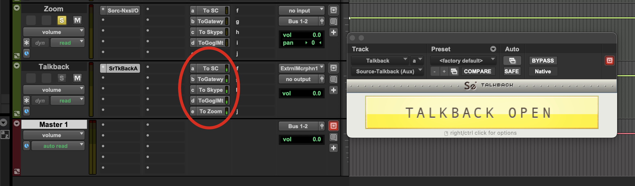 - Agregue los siguientes SENDS para poder mandar su talkback a todos los puntos de comunicación: “To SC”, “To Gateway”, “To Skype”, “To GoogleMeet”, “To Zoom”. Asegúrese de que todos los atenuadores estén ARRIBA (opción+clic en el atenuador en Mac, alt+clic en el atenuador en Windows).