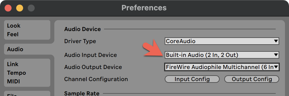 Mientras esté aquí, haga clic en la pestaña Audio para confirmar su configuración. Utilizo la configuración que se muestra a continuación, ya que uso el micrófono incorporado de mi computadora portátil junto con un par de parlantes externos conectados a mi interfaz de audio multicanal Firewire:
