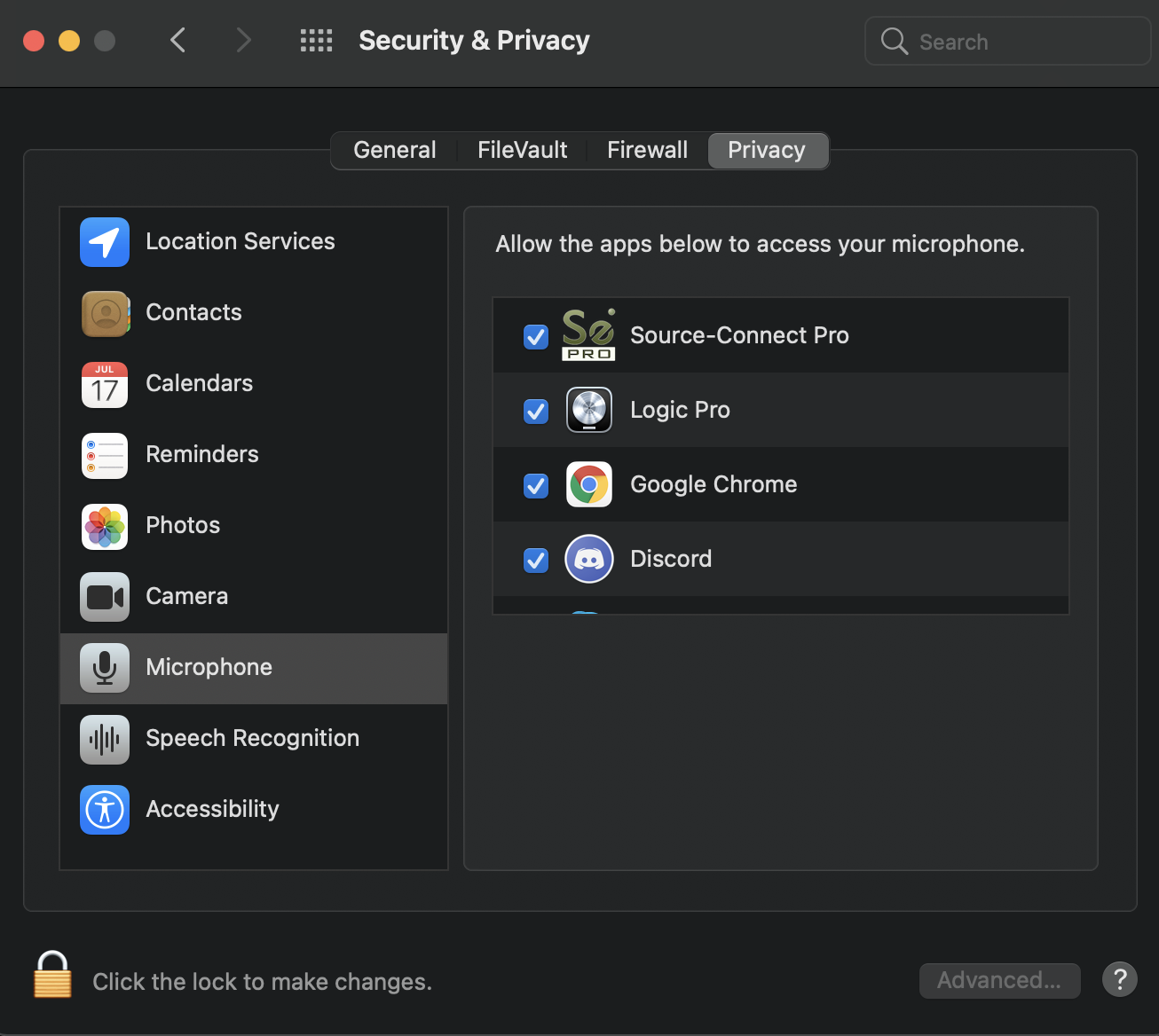 Vaya a Preferencias del sistema > Seguridad y privacidad > Micrófono y asegúrese de que TODAS las aplicaciones que interactúan con Source-Nexus I/O , incluida su DAW y cualquier otra aplicación que envíe/reciba audio, estén marcadas en la lista de la derecha.