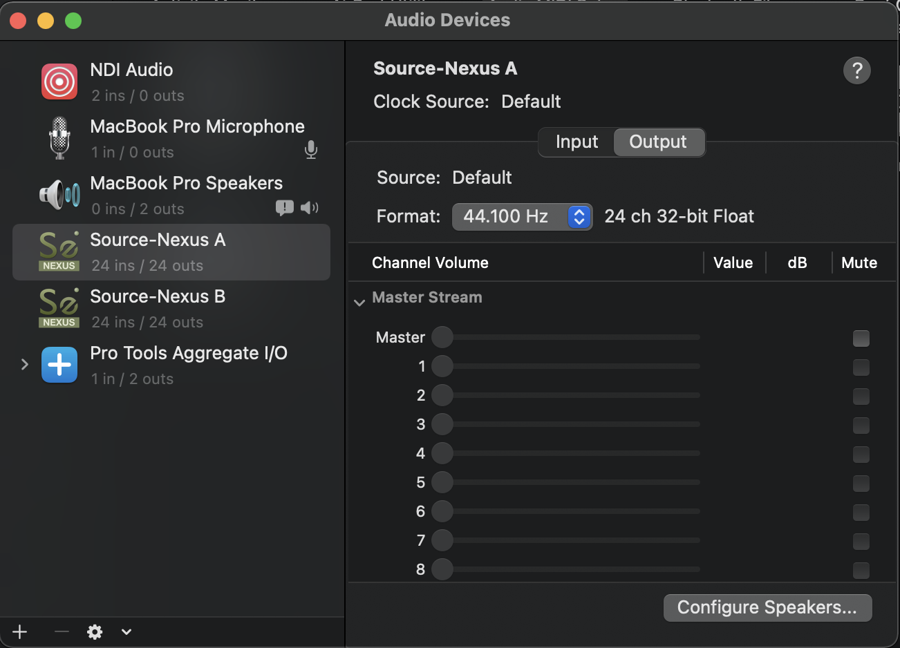 Verifique que el controlador Source-Nexus I/O no esté silenciado en la configuración de Audio MIDI
