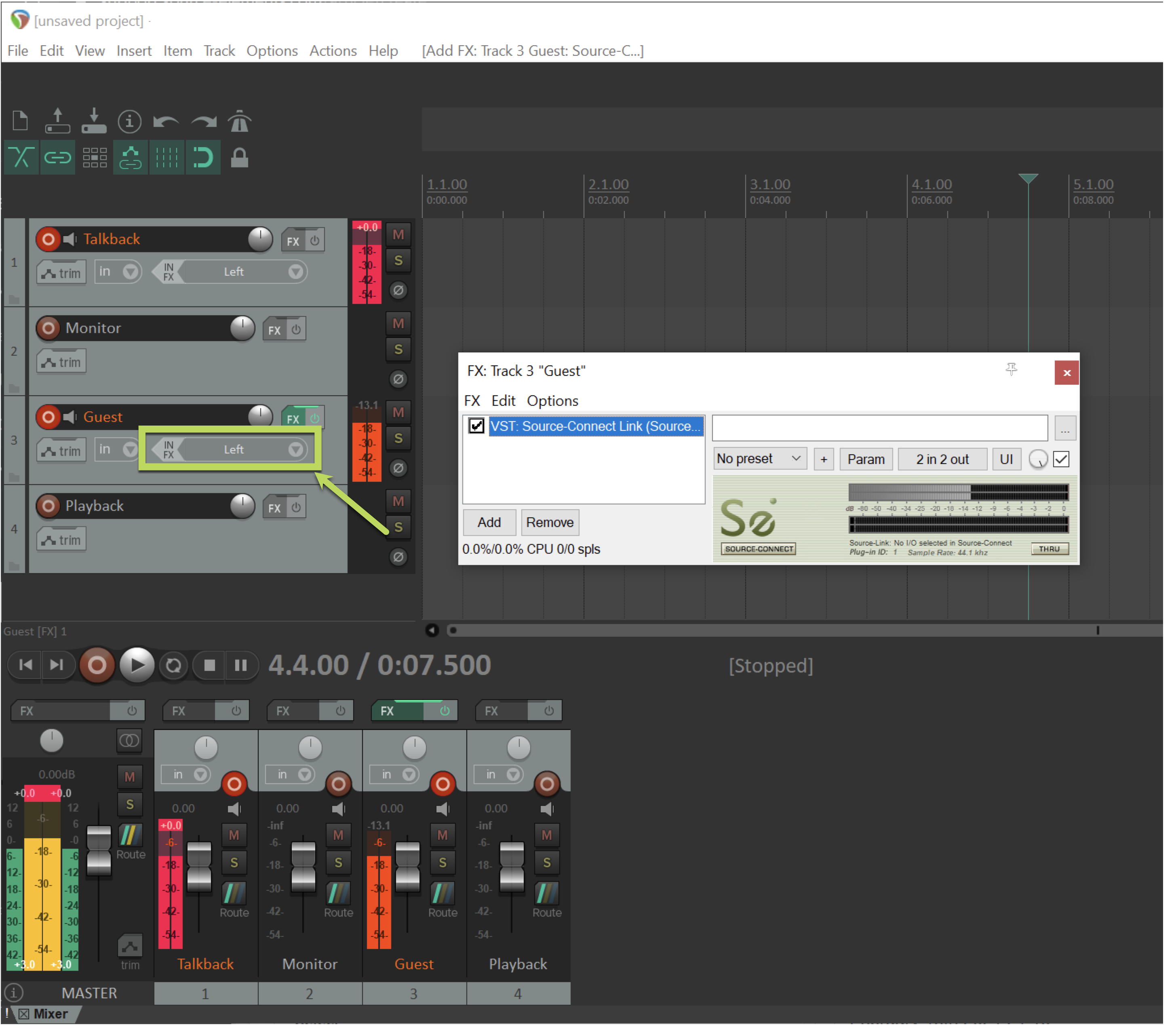 Agregue el complemento Source-Connect VST Link a la pista de invitado. Puede hacerlo haciendo clic en el botón "FX" en la "Pista invitada" y seleccionando VST: Source-Connect Link ( Source Elements ) de la lista.