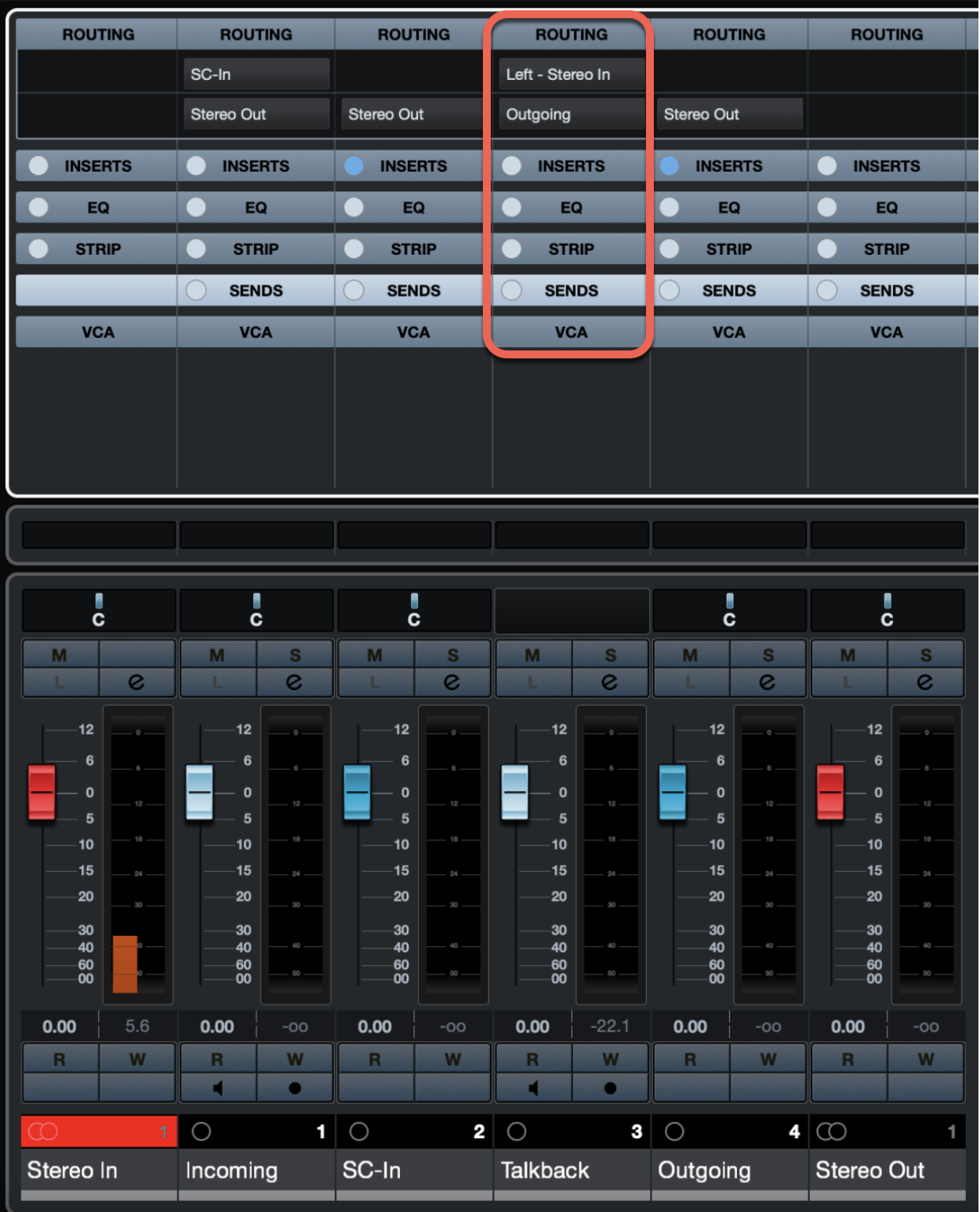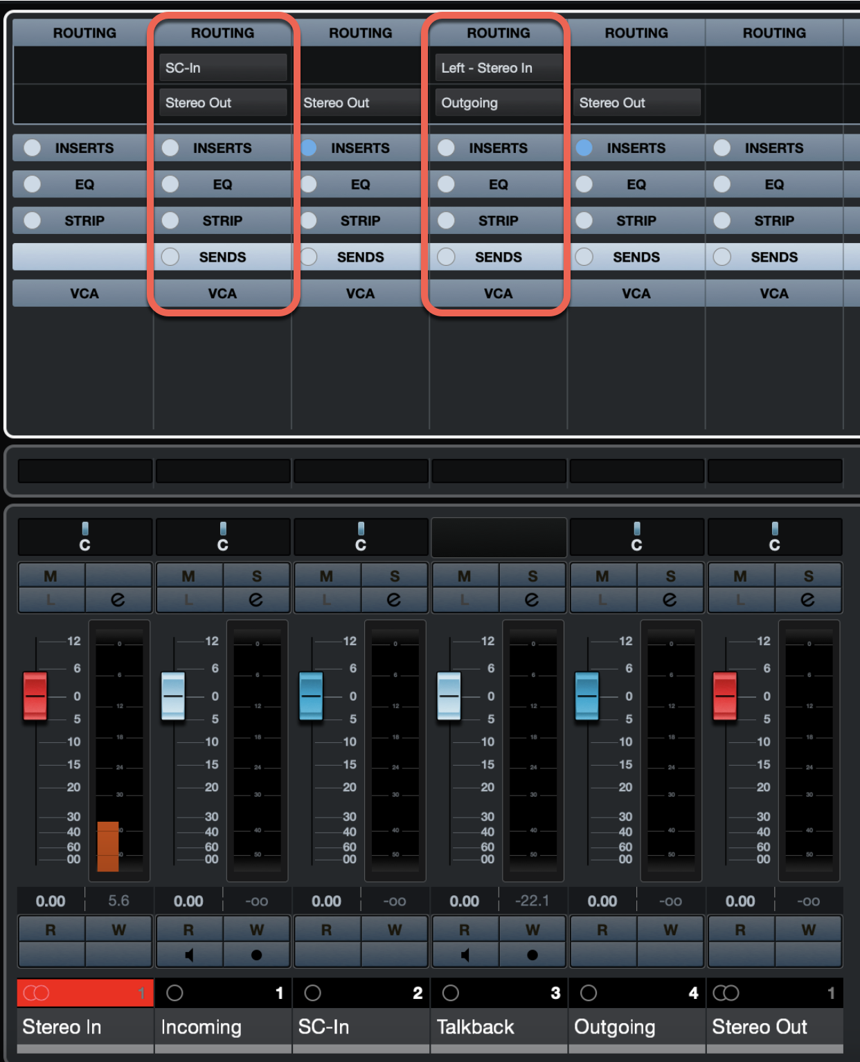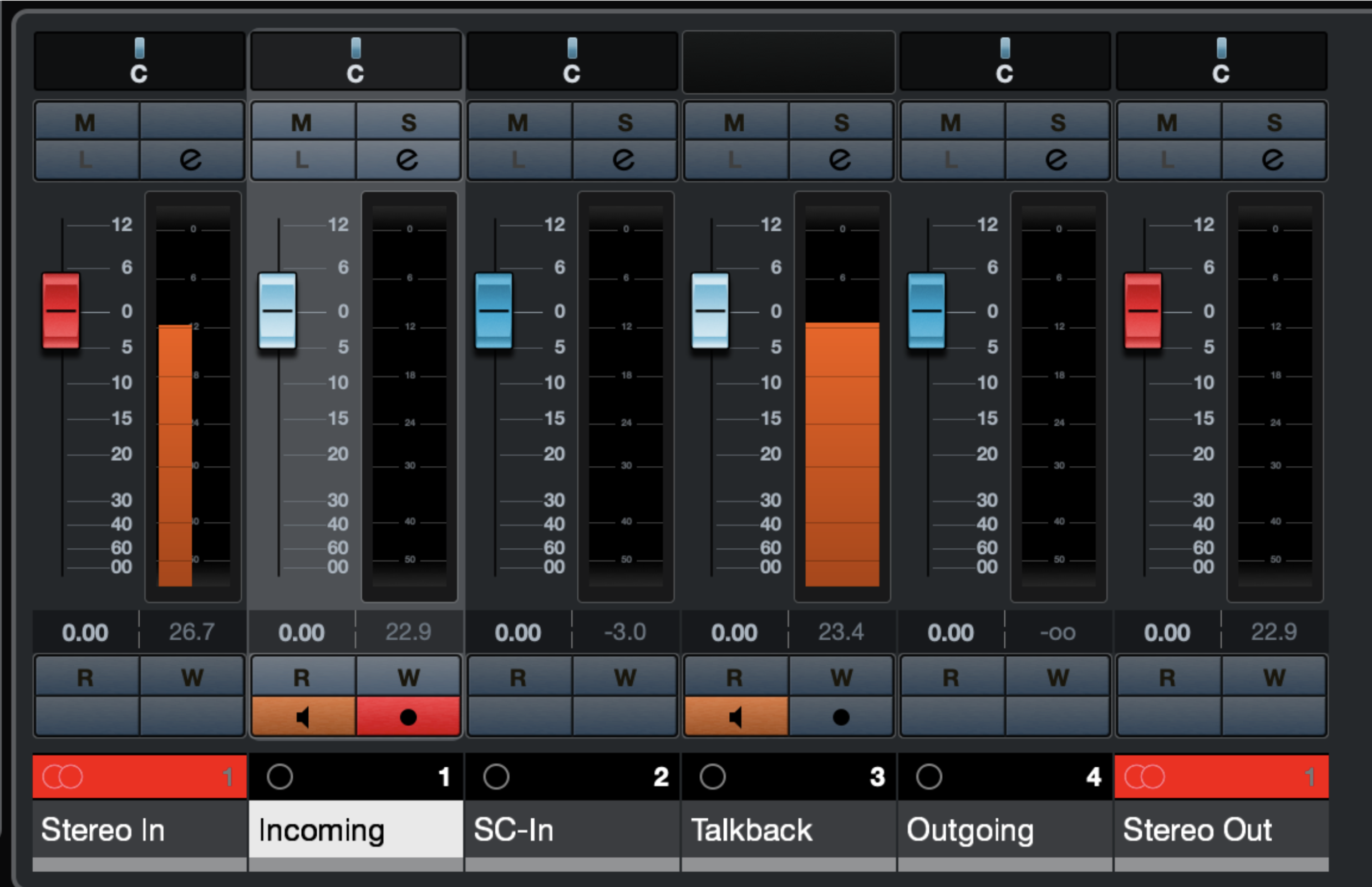 - Ahora verá los canales de entrada a la izquierda de los canales entrantes, talkback y salientes. Sus fuentes de entrada recibirán nombres de acuerdo con la ventana Conexiones VST (F4).
