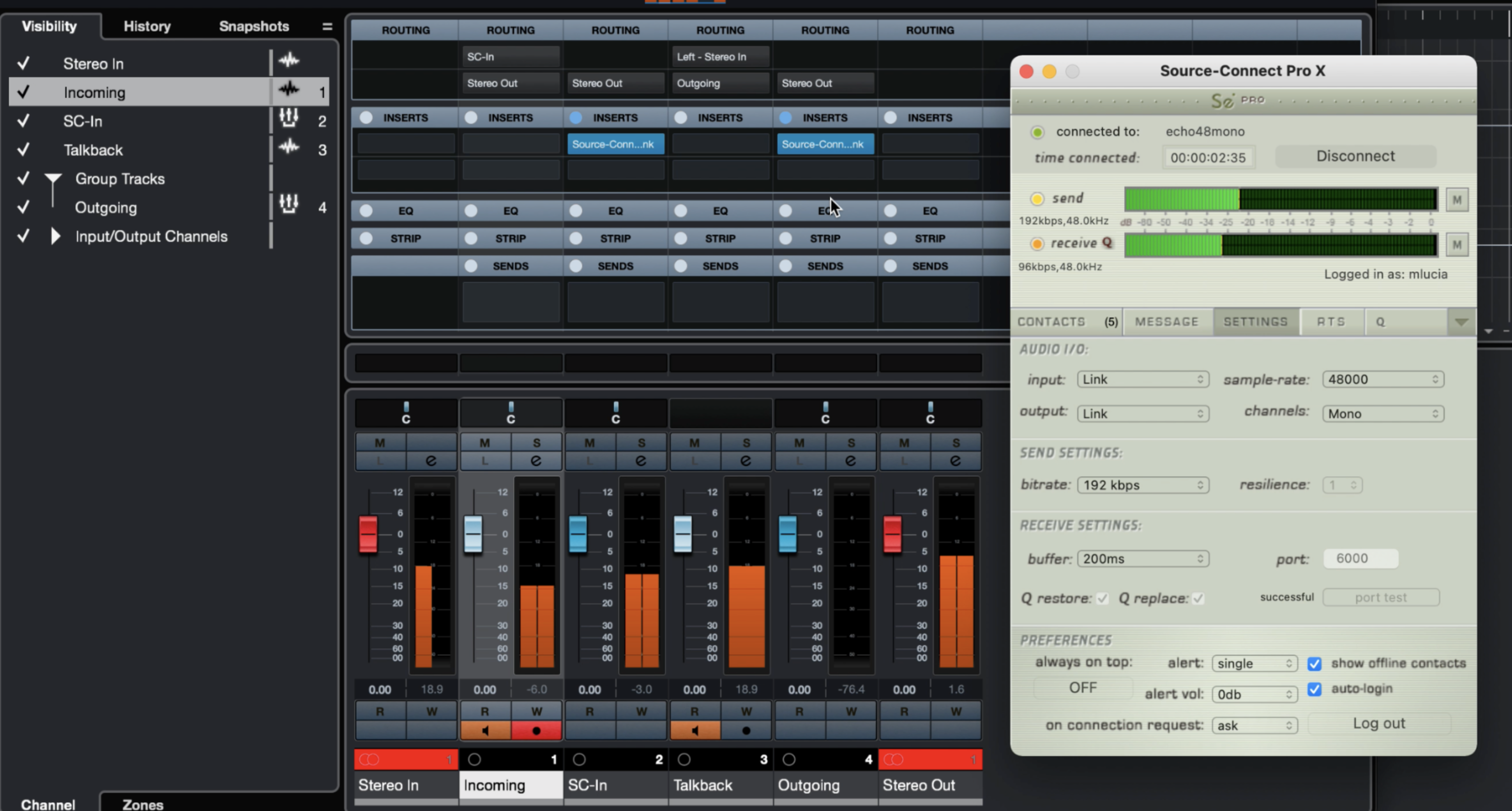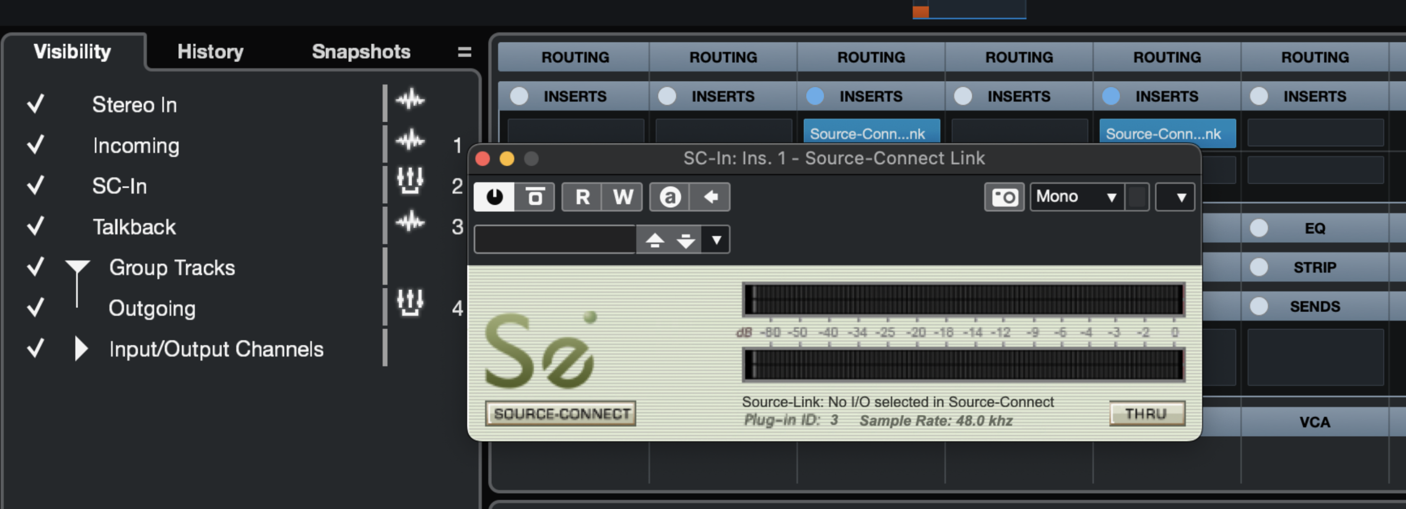 - Ahora asegúrese de que la entrada a la pista entrante esté configurada en el mismo canal de entrada en el que creó una instancia del complemento Source-Connect para el canal de entrada. En la imagen de abajo, el canal entrante se alimenta a través de SC-In y el canal Talkback se alimenta a través de Left - Stereo In. Sus fuentes de entrada recibirán nombres de acuerdo con la ventana Conexiones VST (F4).