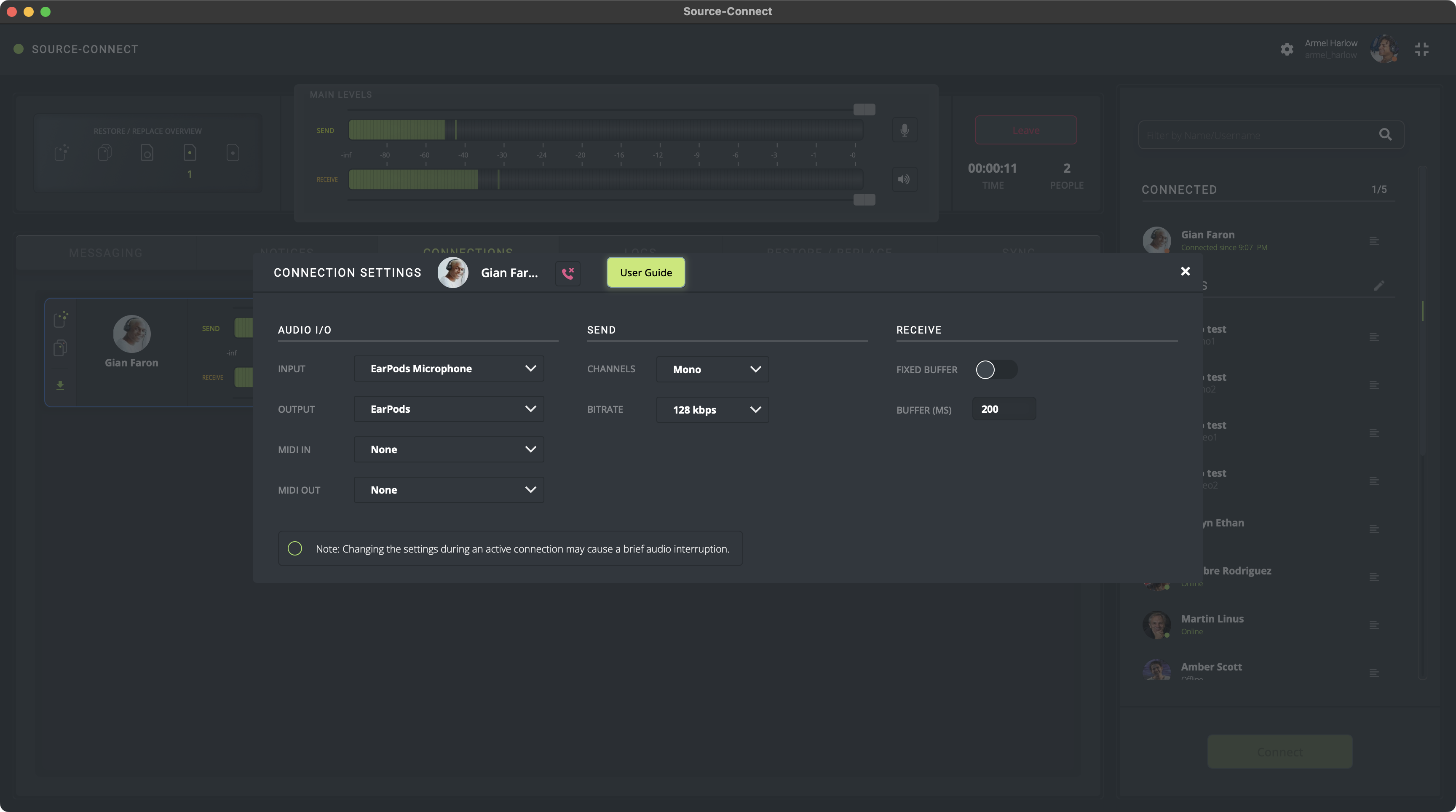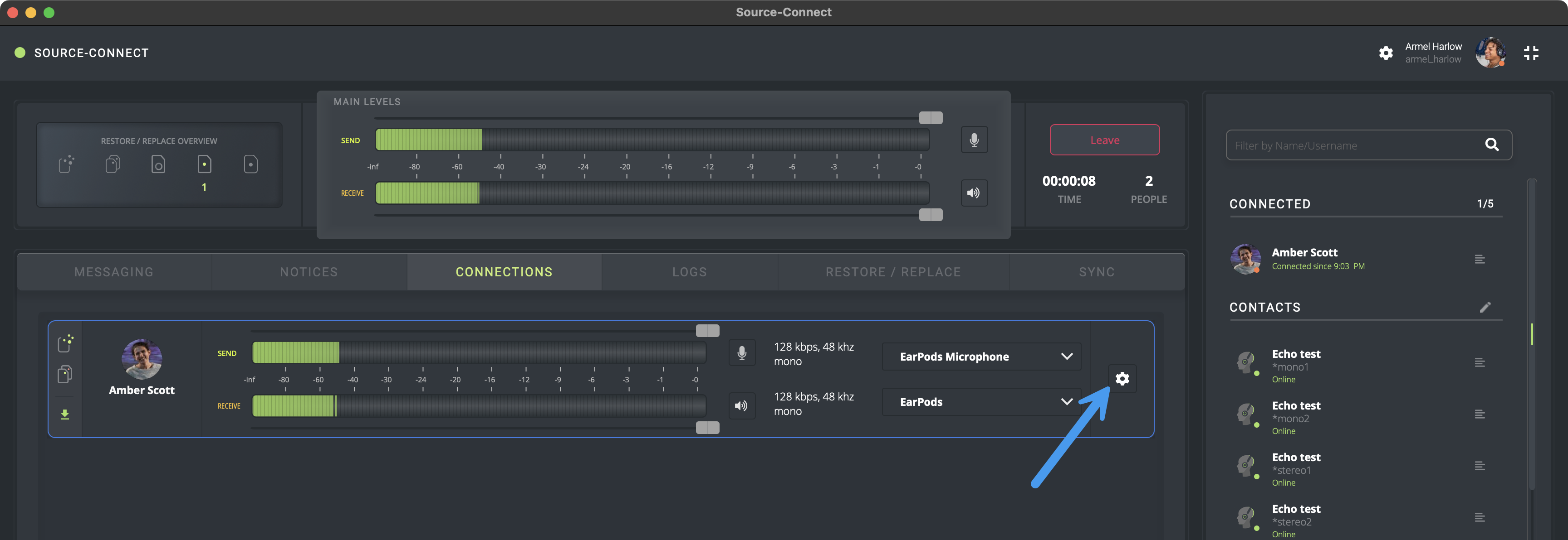 Mientras estás en una llamada con otro usuario, es posible que necesites cambiar tu configuración de audio (entrada o salida, por ejemplo). Hay un subconjunto de configuraciones que se pueden cambiar en el menú CONEXIONES, accediendo al ícono de ajustes al lado de cada socio de conexión específico: