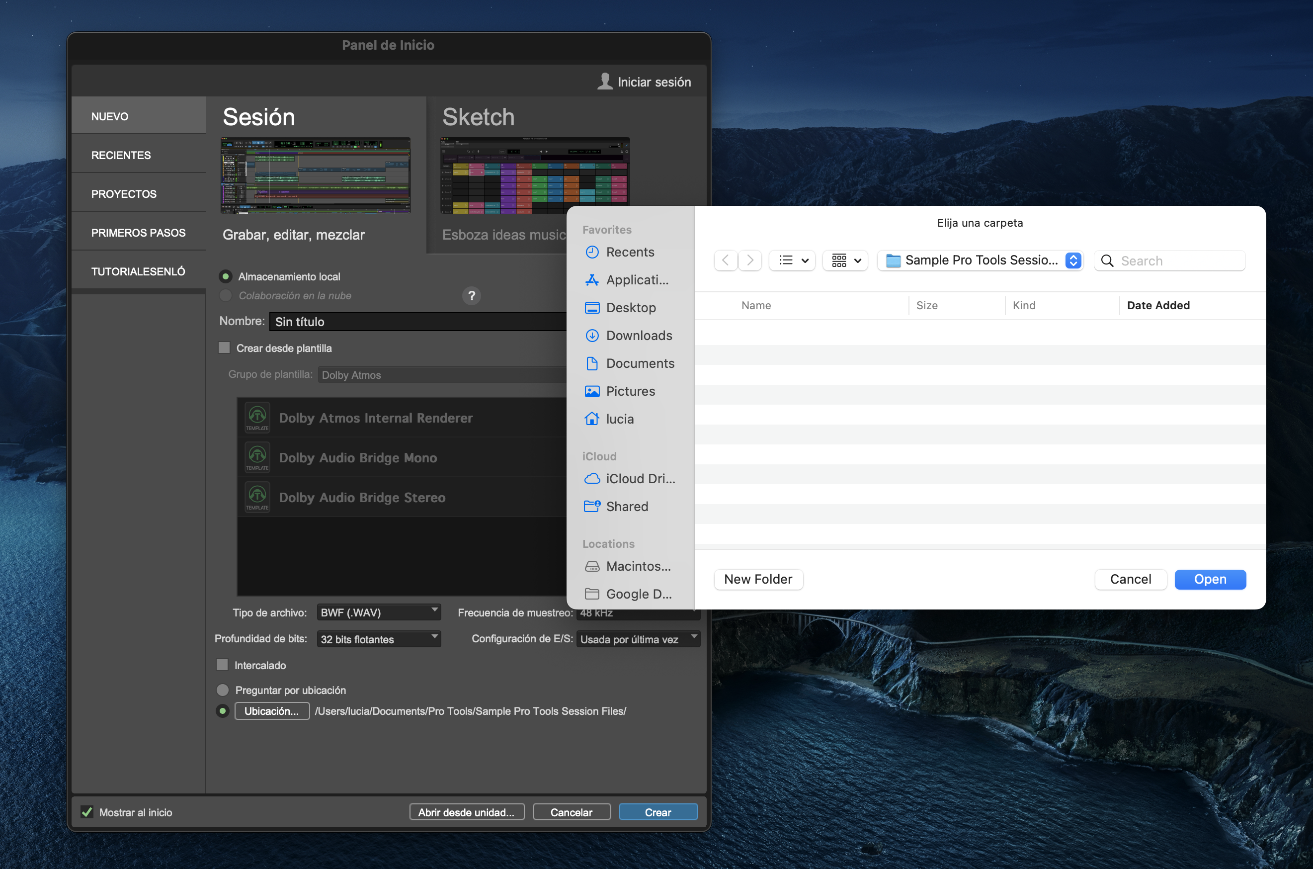 a. Abre Pro Tools. En la ventana que se te muestra, bajo “Ubicación”, elige la carpeta que creaste en el paso 1. Luego, haz clic en “Crear”.