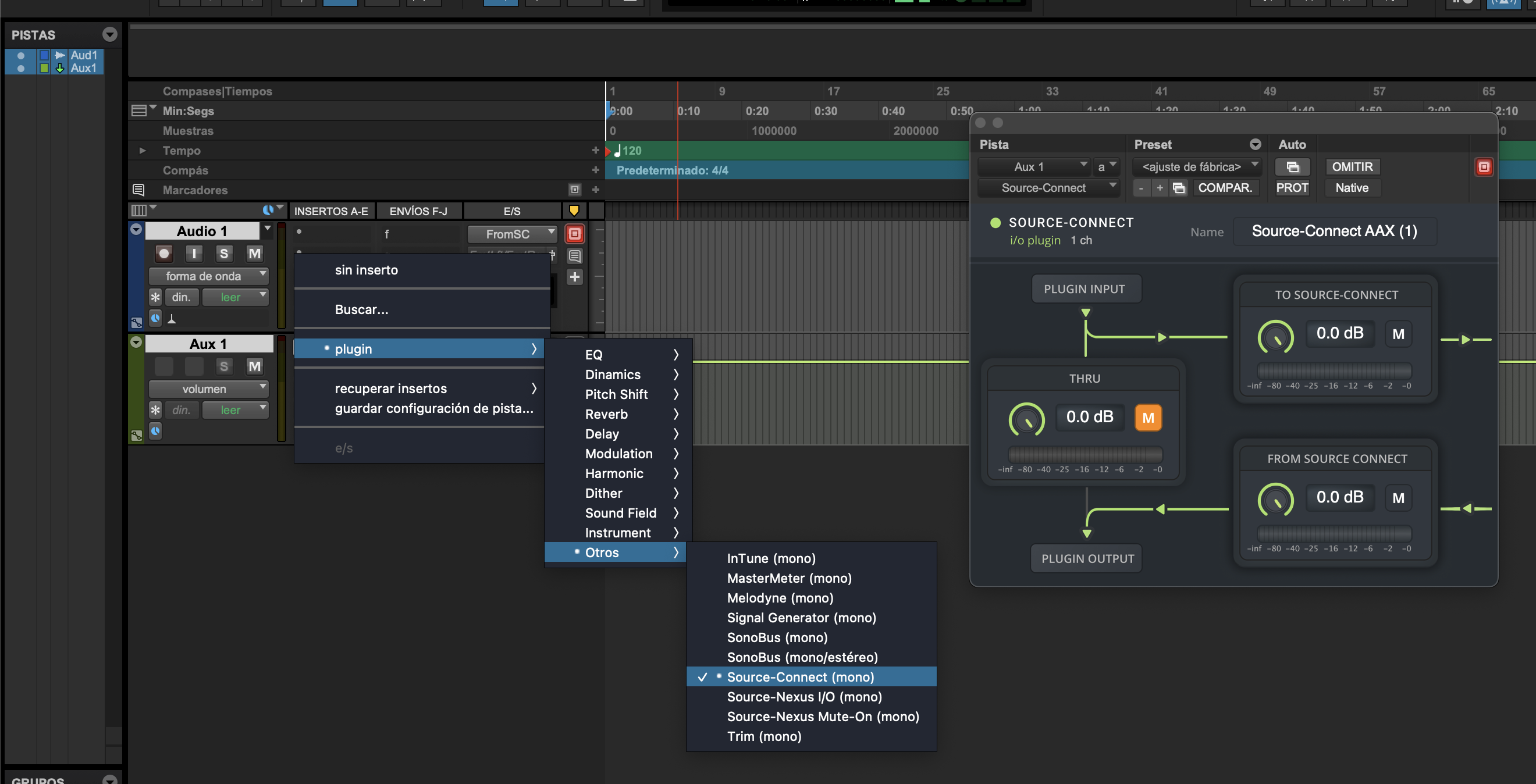 g. En la columna de INSERTOS de la entrada auxiilar, haz clic en “plugin” > “Otros” > “Source-Connect (mono)”: