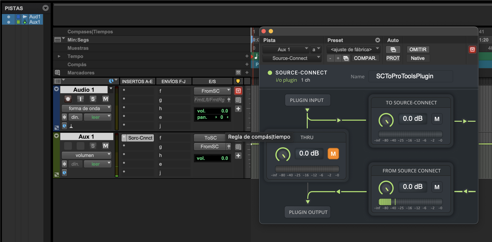 g. En la sección de AUDIO I/O, selecciona SCToProToolsPlugin como tu output.