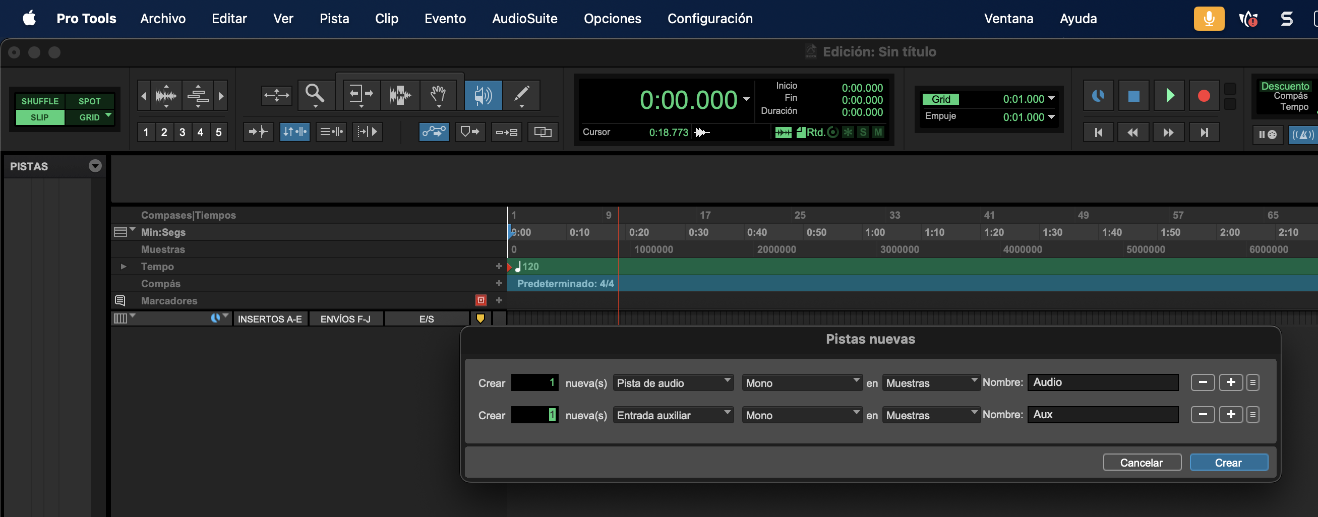 e. Agrega dos pistas: una pista de audio mono y una entrada auxiilar.