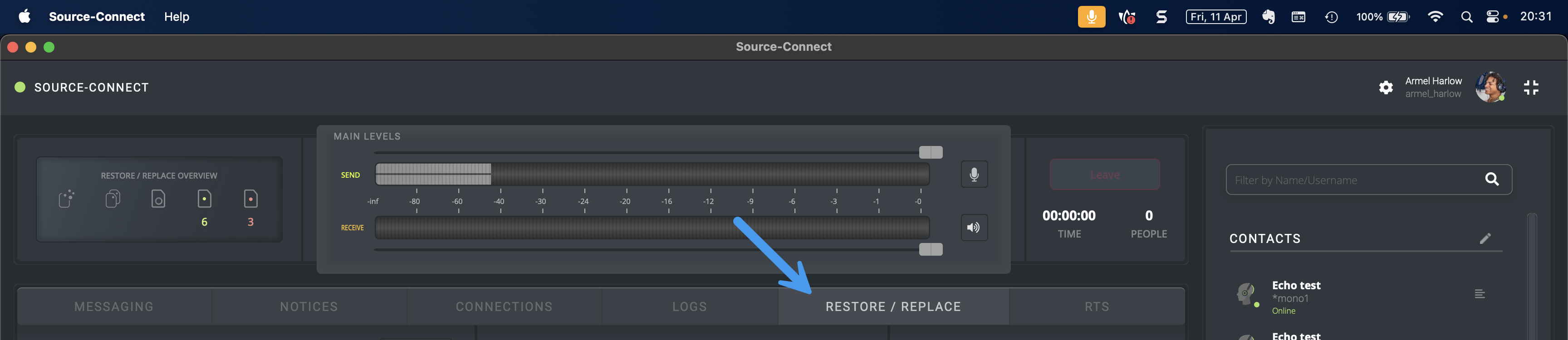 h. En el panel de Contacts, haz clic en el ícono de tu contacto y haz clic en el botón Connect. Asegúrate que tanto “Restore” como “Replace” estén encendidos.