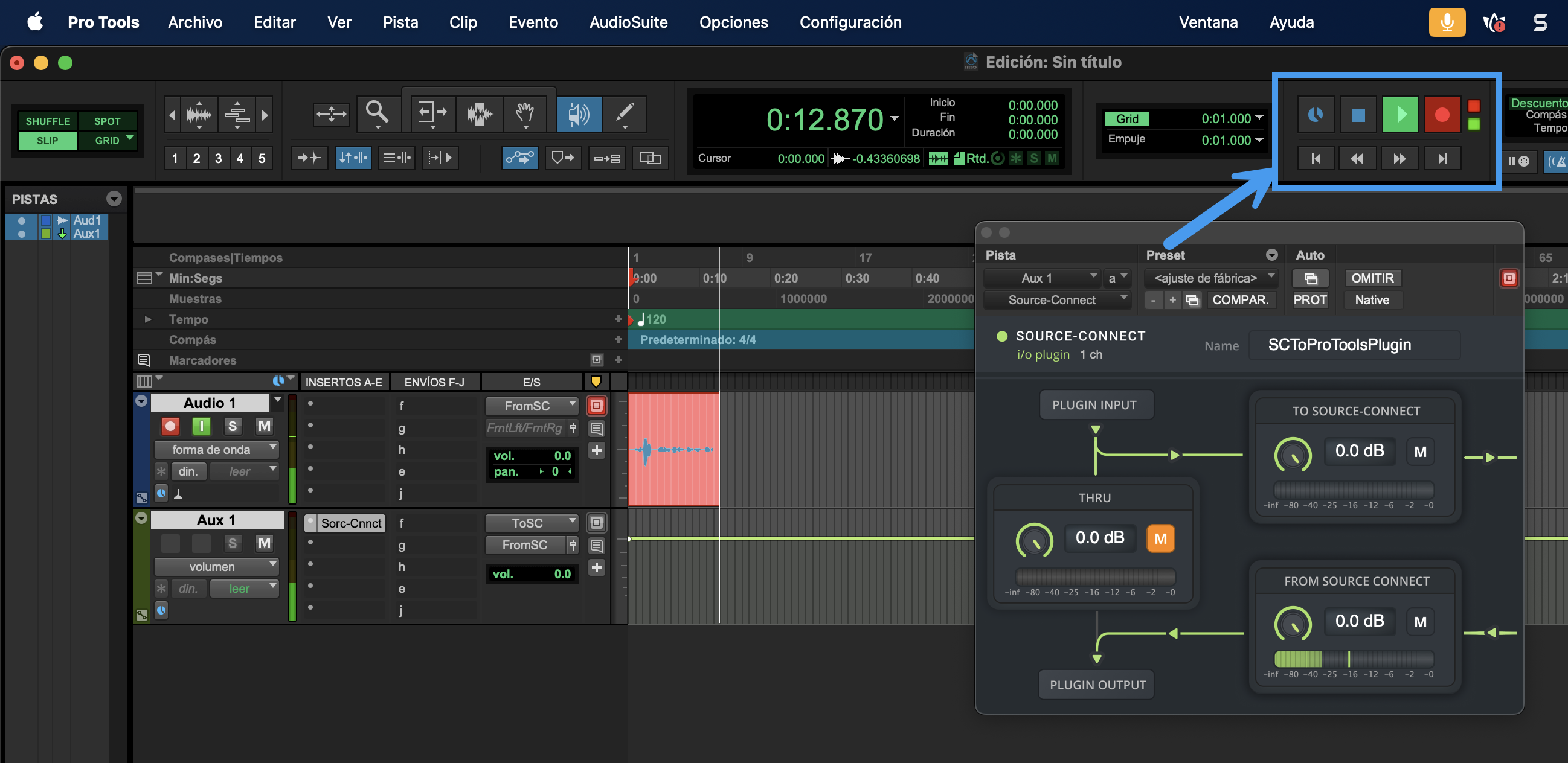 En Pro Tools, haz clic en el botón rojo de “Activación para la grabación” y “Reproducir” para comenzar a grabar: