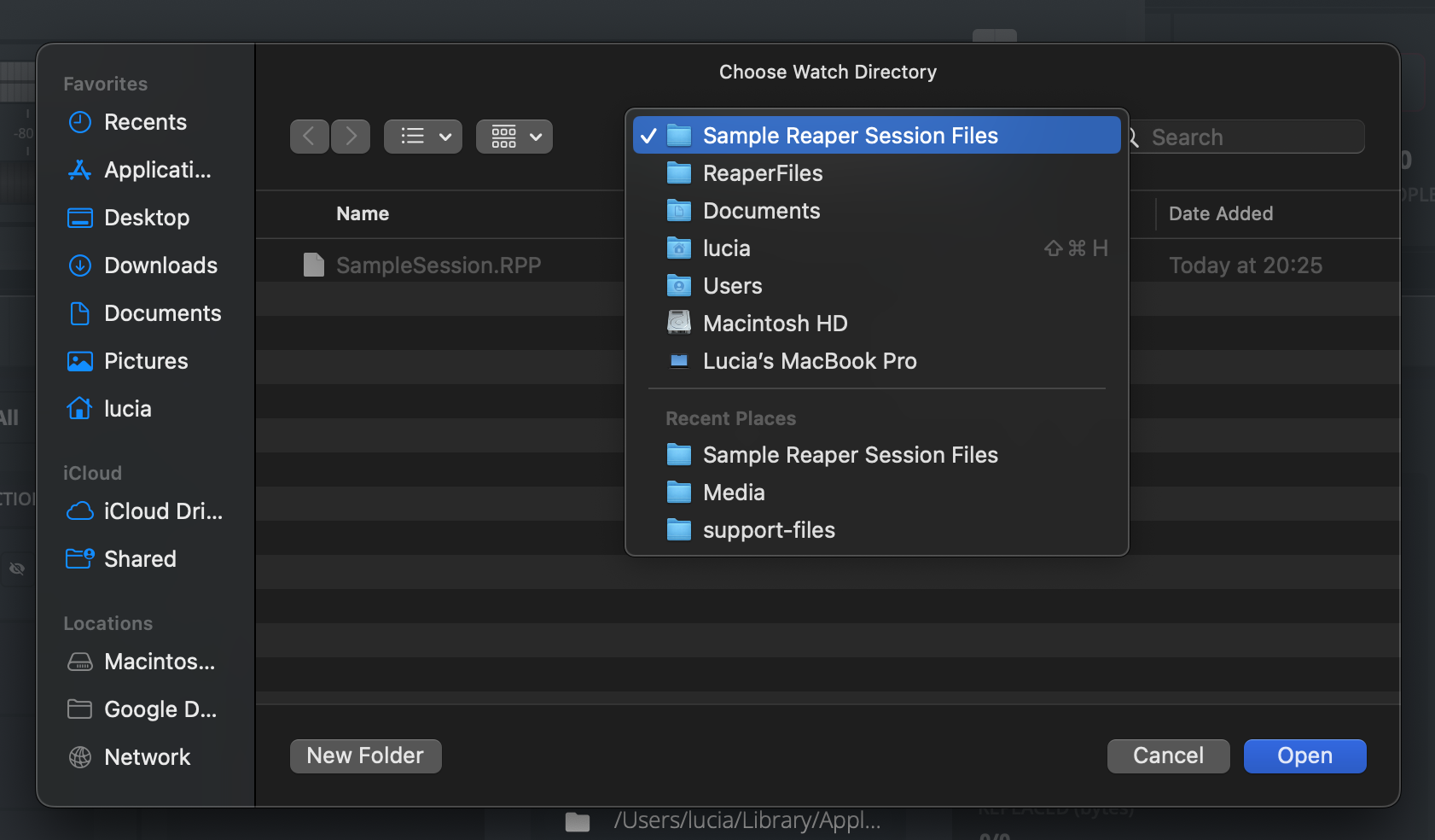d. Elige la carpeta que creaste en el paso 1 ("Sample Reaper Session Files").