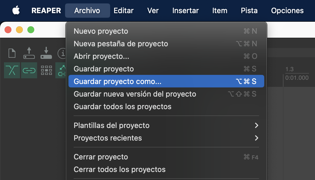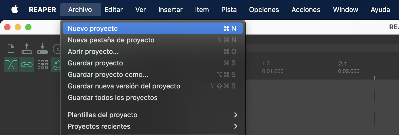 a. Ve a Archivo > Nuevo proyecto para agregar un nuevo proyecto de Reaper.