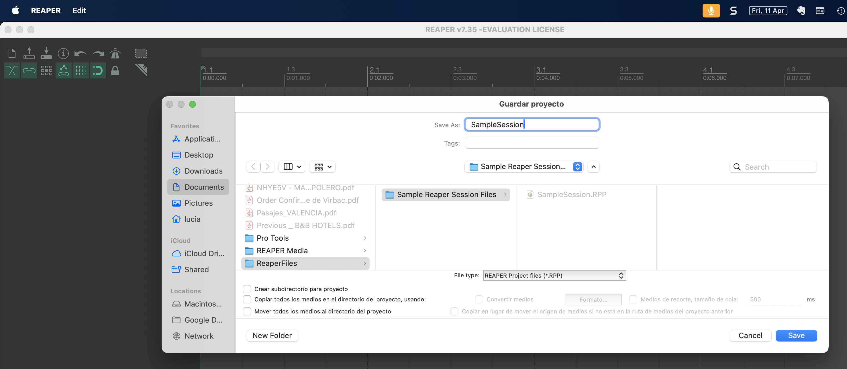 c. Guarda el proyecto en la misma carpeta que creaste en el paso 1 (en nuestro caso, “Sample Reaper Session Files”). Nómbralo “SampleSession”.
