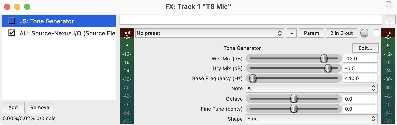 g. Haz clic en el botón FX de la pista TB Mic. Inserta un complemento de volumen antes del complemento de Source-Nexus I/O. En la siguiente imagen, verás que tan sólo insertamos un complemento llamado “JS: Tone Generator” (apagado).