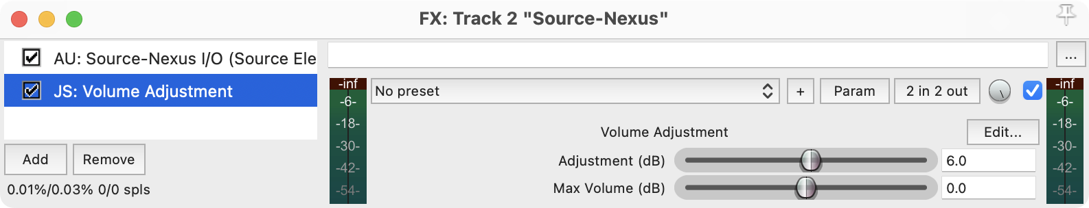 h. Haz clic en el botón FX para la pista Source-Nexus. Inserta cualquier complemento de ajuste de volumen luego del complemento de Source-Nexus I/O, y asegúrate de que tenga +6dB en el campo de “Adjustment”.