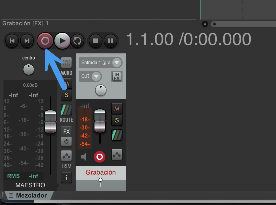 En Reaper, haz clic en el botón rojo de “Grabación” en el Mezclador.