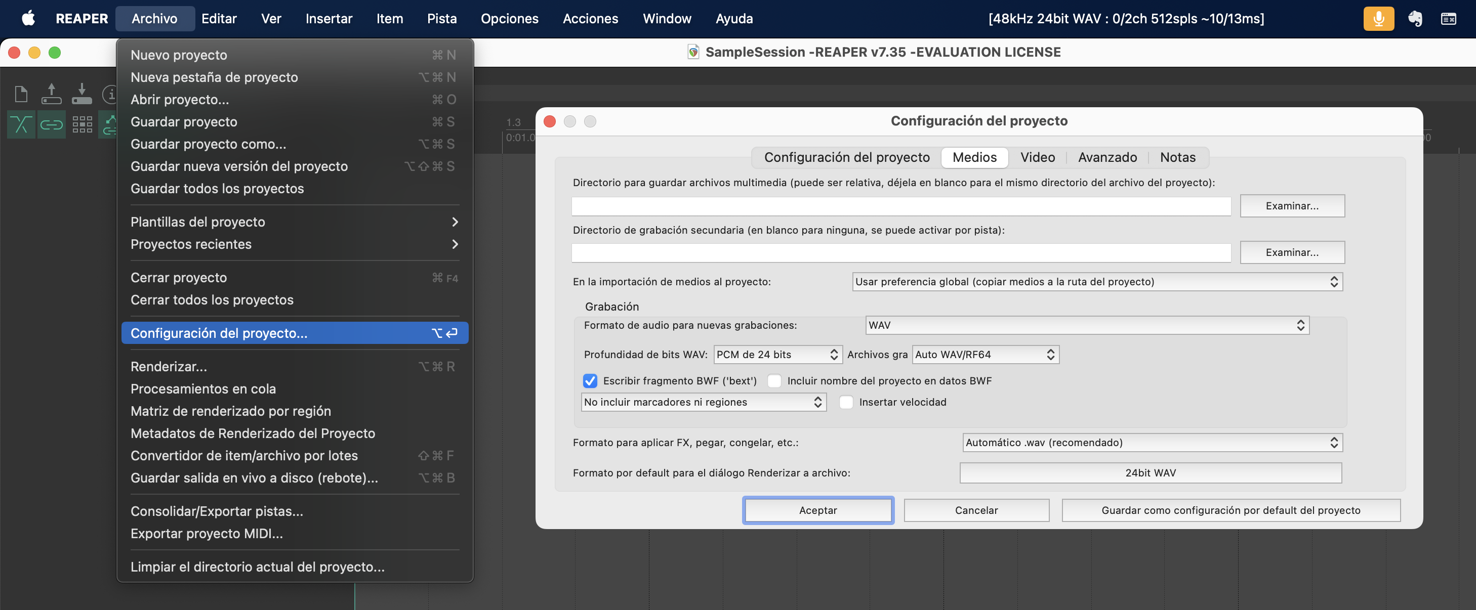 d. Ve a Archivo > Configuración del proyecto. En la pestaña Medios, asegúrate que Directorio para guardar archivos multimedia (puede ser relativa, déjala en blanco para el mismo directorio del archivo del proyecto) haya quedado vacío. De esa forma, los archivos de audio serán guardados en la misma carpeta que el archivo de proyecto .rpp.