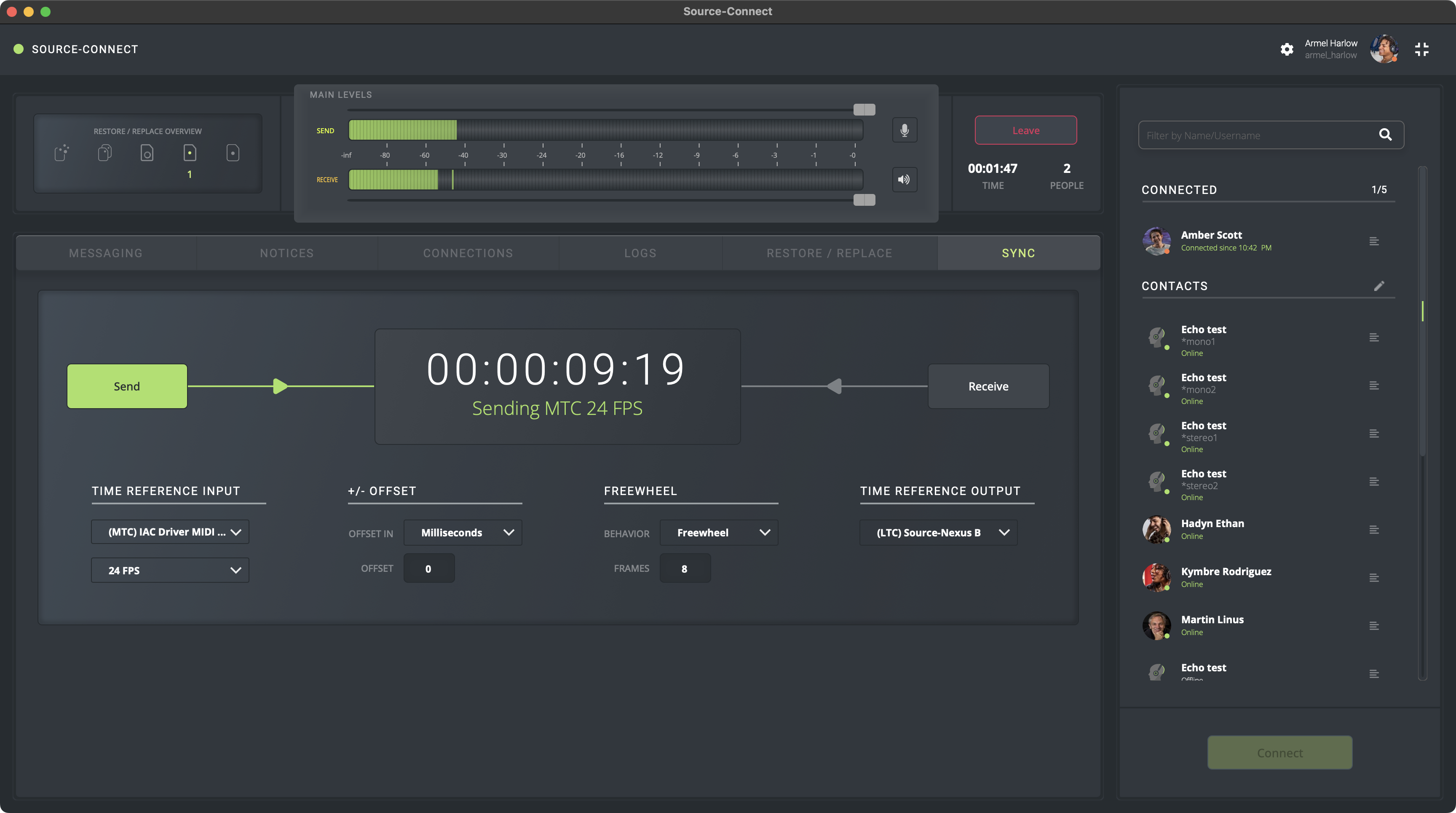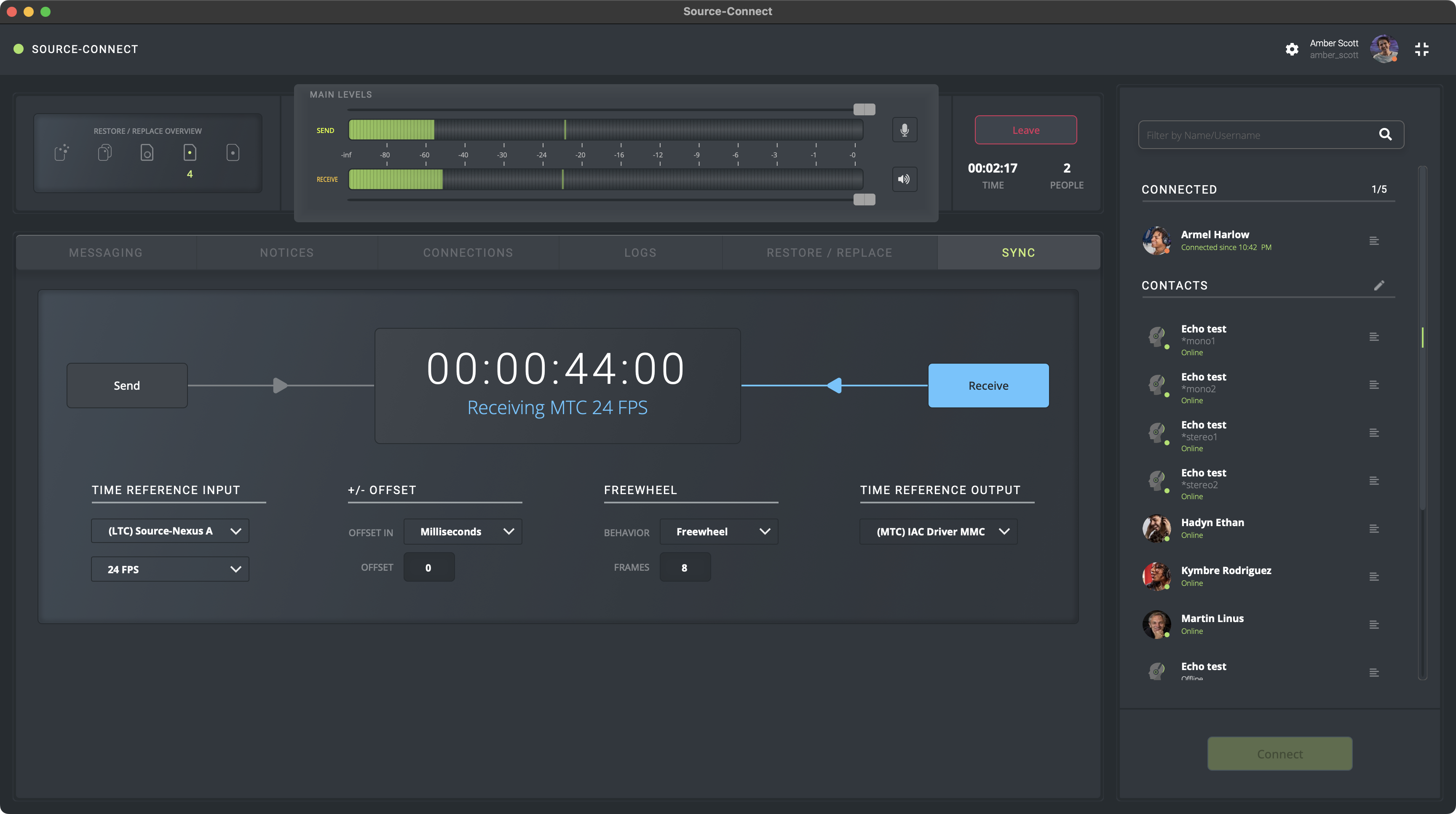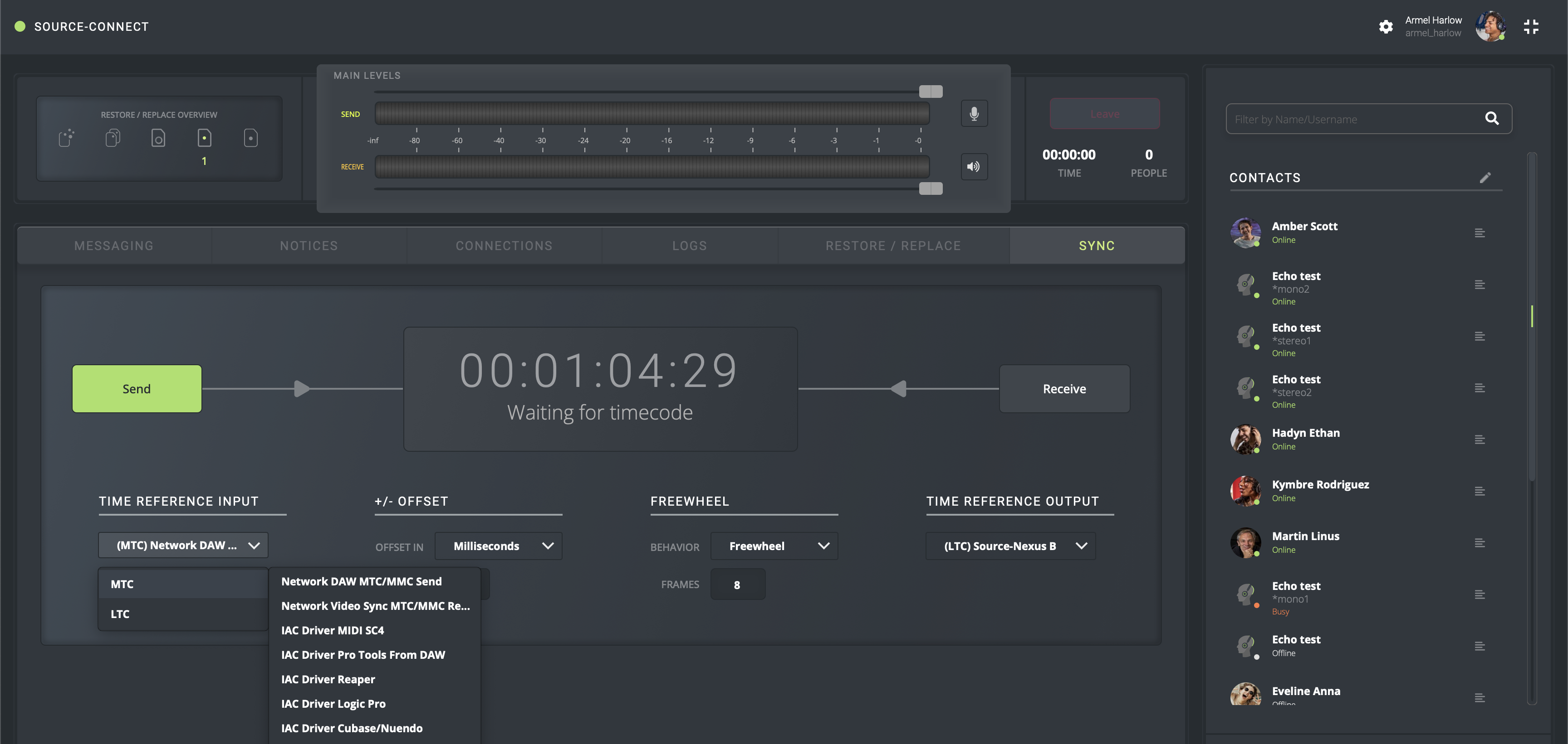 En el siguiente ejemplo, Cubase/Nuendo envía código de tiempo utilizando “Network DAW MTC/MMC Send”, que es visible en la pestaña SYNC de Source-Connect 4. El usuario “Amber” está enviando el código de tiempo: