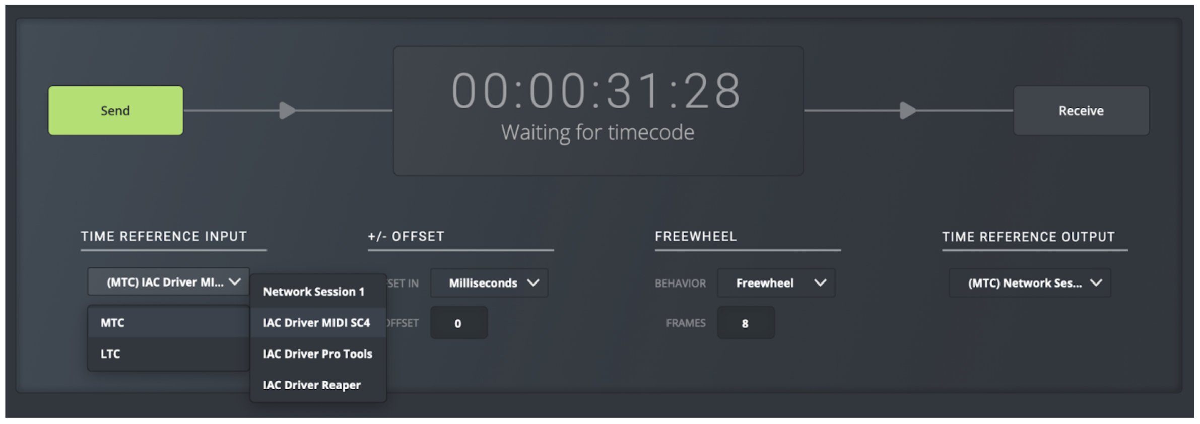 - En "ENTRADA DE REFERENCIA DE TIEMPO", seleccione "MTC" y el nombre de su dispositivo MIDI (lo llamamos "MIDI SC4" arriba).