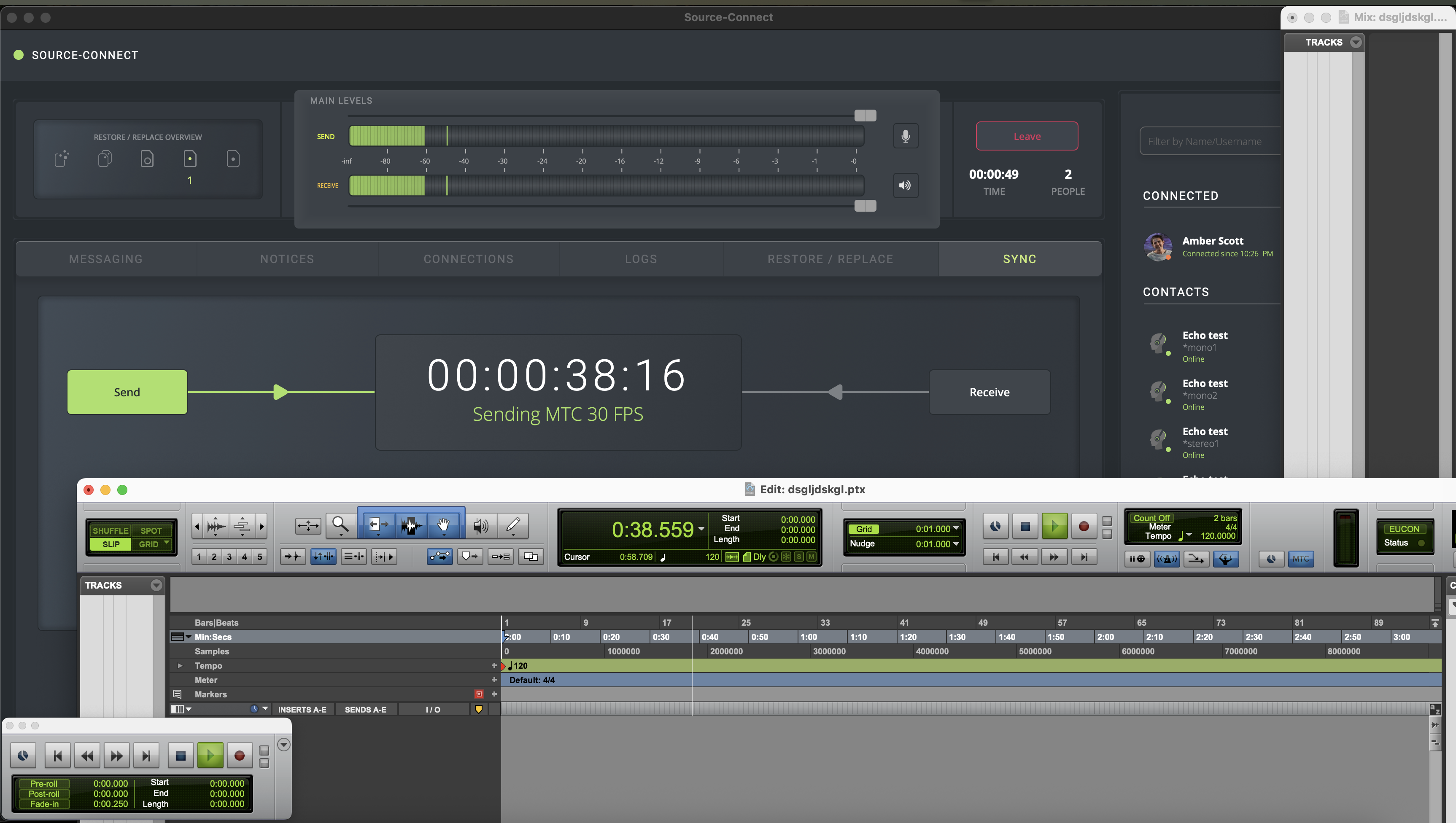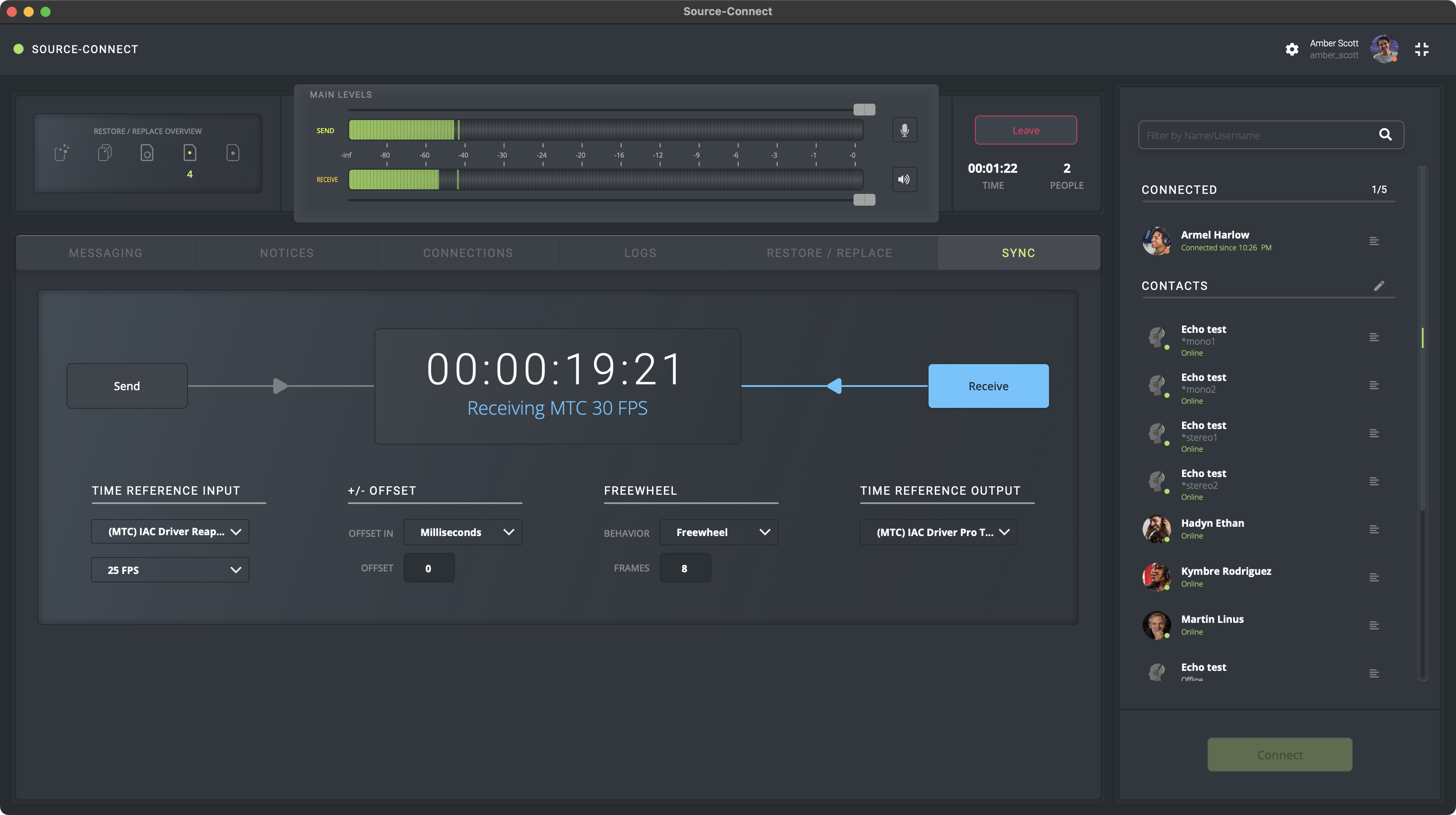 En el siguiente ejemplo, Pro Tools envía código de tiempo usando “IAC Driver, MIDI SC4”, que es visible en la pestaña SYNC de Source-Connect 4. El usuario “Amber” está enviando el código de tiempo:
