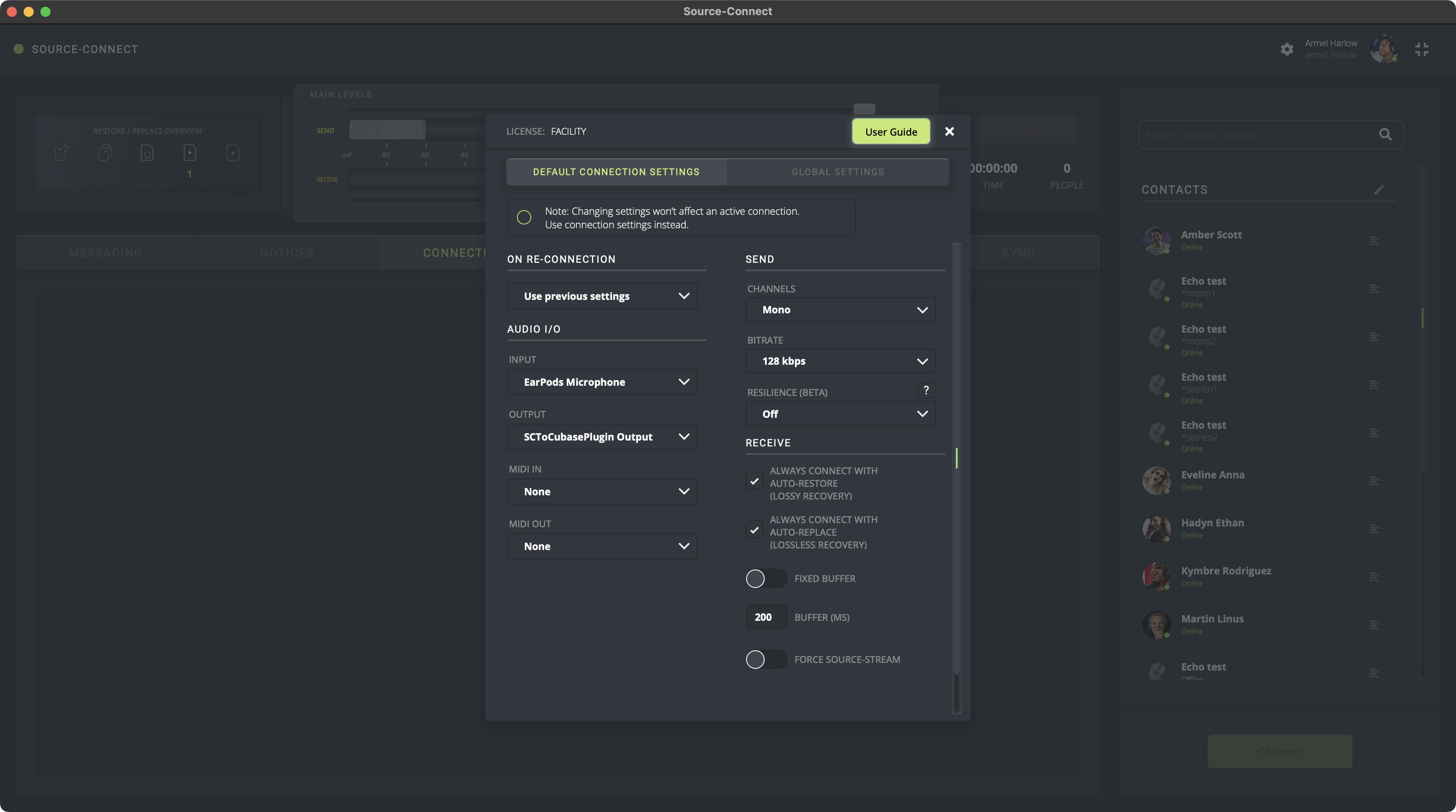 2. En Source-Connect, abra el panel de Configuración (icono de engranajes). Luego, en los menús desplegables de E/S, seleccione el complemento en la sección Source-Connect I/O.
